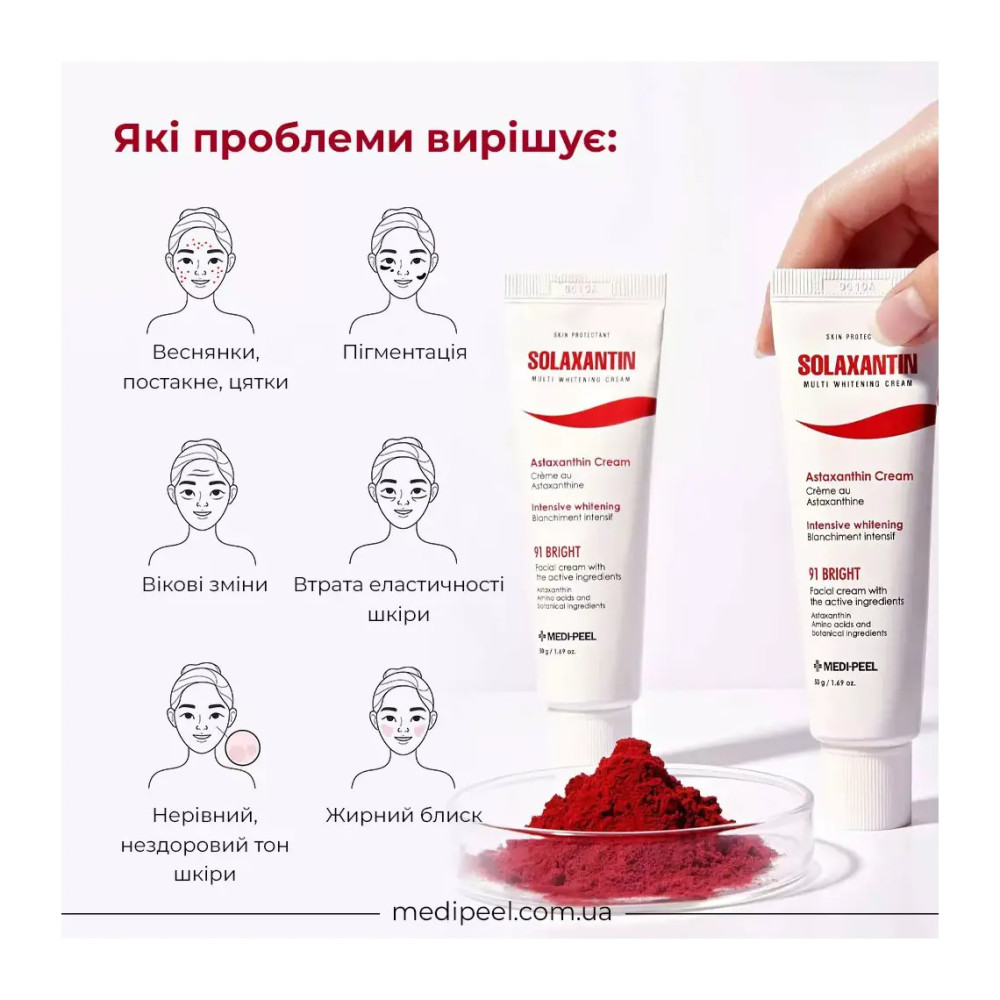 Особливості Solaxantin Multi Whitening Cream від Medi Peel:- діє як антиоксидант і відбиває атаку вільних радикалів;- вирівнює тон шкіри та усуває пігментацію;- впливає прямо на меланін у шарах епідермісу;- мінімізує ризики появи зморшок та надає шкірі пружності;- зміцнює захисний шар епідермісу;- активізує формування колагенових та еластинових волокон;- прибере постакне і допоможе набути рівного тону без косметики.