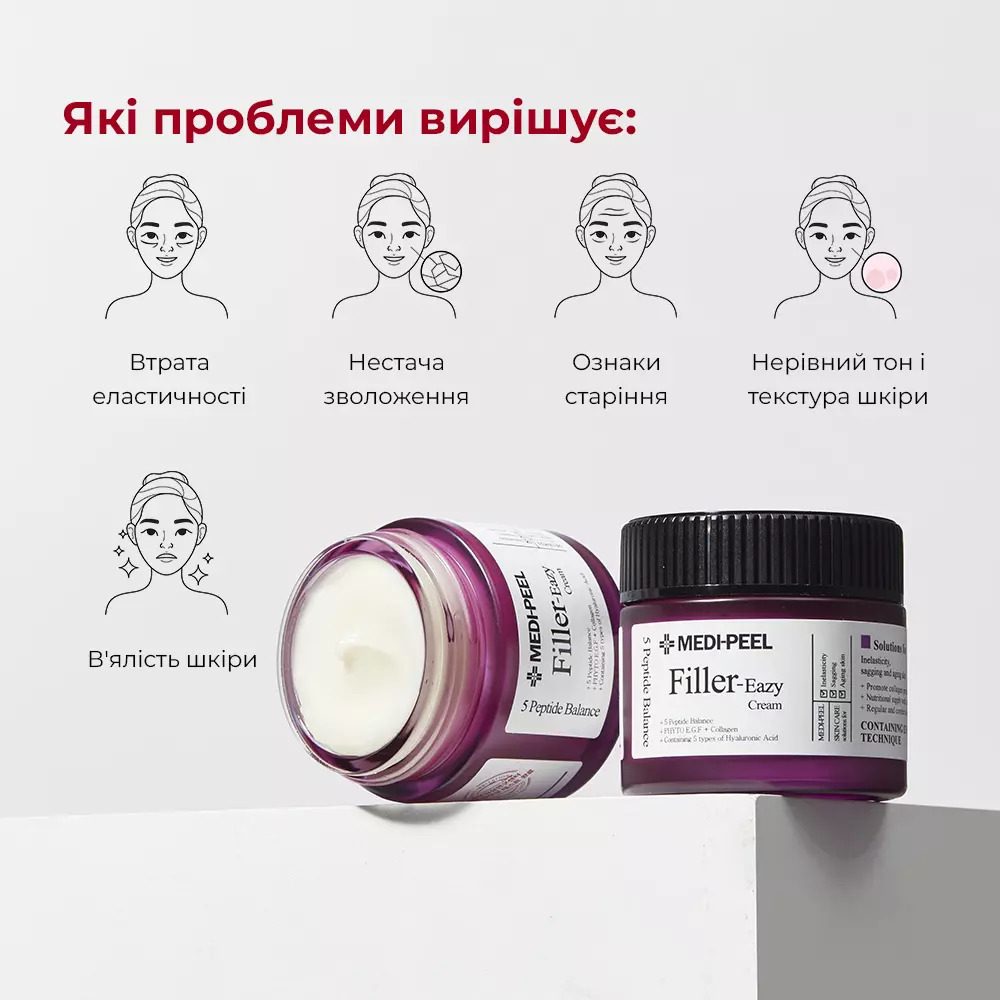Омолоджувальний крем Medi-Peel Eazy Filler Cream поєднує 5 пептидів і 5 видів гіалуронової кислоти для комплексного догляду за шкірою на різних рівнях епідермісу, стимулює вироблення природного колагену та еластину завдяки аденозину, підвищує пружність і еластичність, уповільнює процеси старіння, а токоферол і ніацинамід забезпечують антиоксидантний захист та покращують текстуру, екстракт граната тонізує і зміцнює шкіру, пантенол глибоко зволожує та заспокоює, а фактори росту EGF роблять шкіру гладкою та пружною для здорового та сяючого вигляду.