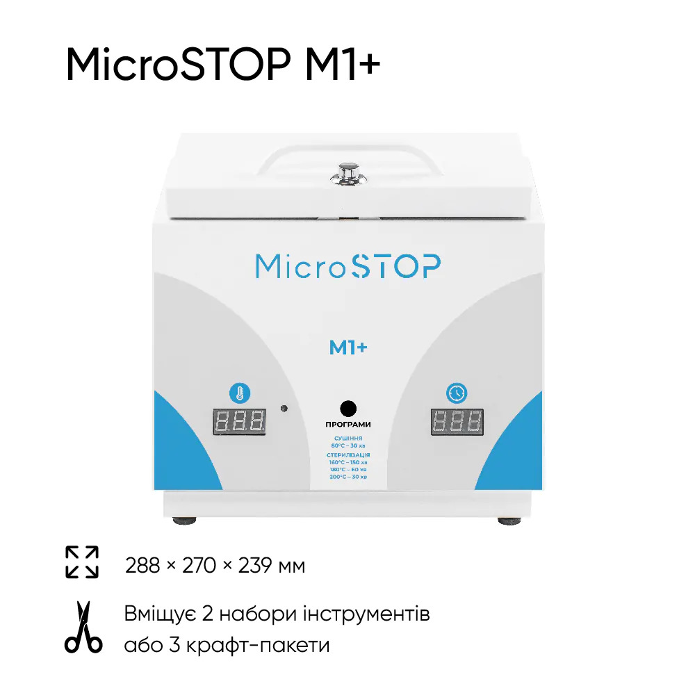 Високотемпературна сухожарова шафа для стерилізації Microstop M1+Сухожаровий стерилізатор М1+ вміщує 2 набори інструментів або 3 крафт-пакети.Це компактна модель стерилізаторів MicroSTOP, яка підходить невеликим та середнім салонам.Прилад працює в трьох режимах і підтримує стандарти стерилізації МОЗ України. Для зручності майстрів доданий режим “сушки”. 200 °C – 30 хв, 180 °C – 60 хв, 160 °C – 150 хв, Режим сушіння: 80 °C – 30 хв.Має гарантію 18 місяців.Сертифікований в Україні.*Не для продажу за межами України. Гарантійні зобовʼязання компанії MicroSTOP щодо сухожарового стерилізатора MicroSTOP M1+ діють лише на території України.Виготовлені в Україні, сухожарові стерилізатори MicroSTOP мають широкий спектр застосування: використовуються в медицині, ветеринарії, сфері бьюті (побутового обслуговування), в тату та косметичних салонах. Призначені для повітряної стерилізації виробів з металу, скла та силікону, з відміткою +200°C.Сухожарові стерилізатори MicroSTOP сертифіковані згідно міжнародних стандартів і мають сертифікат ISO13485.Вони є медичним обладнанням, відповідають вимогам технічного регламенту щодо медичних виробів, та включені в державний реєстр медвиробів. Стерилізатор повинен експлуатуватися у приміщеннях зі штучно регульованими кліматичними умовами у діапазоні температур від +10°C до +35°C, за атмосферного тиску 837-1064 кПа і при відносній вологості повітря від 40% до 80% при +25°C. Стерилізатор призначений для роботи від однофазної мережі змінного струму, напругою 220 В ± 10% і частотою 50 Гц.Технічні характеристики сухожарової шафи MicroSTOP М1+Об’єм стерилізаційної камери 2 л.Зовнішні розміри (ш,г,в) 288 х 270 х 239 ммРозмір лотка для інструментів (ш,г,в) 215 х 115 х 27 ммМаса в пакованні 6,52 кгМатеріал Сталь нержавіючаНа яку кількість інструментів розраховано У крафт-пакеті – 3 набори; без крафт-пакетів – 2 набори.Потужність 500 Вт/год.Відхилення температури від заданого значення ± 3°CВихід на задану температуру 10-15 хв.Аварійне відключення: ЄГарантія 18 міс.Післягарантійний сервіс ЄНапруга 220ВКраїна виробник Україна