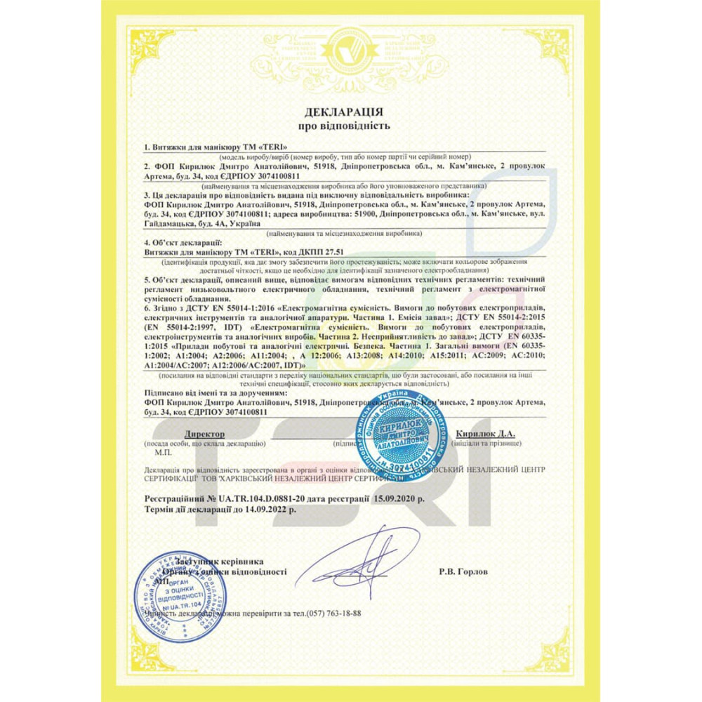 Технічні характеристики:Потужність: 80 ВатТяга (регульована): 2.5 - 4.5 метри за секундуОбороти двигуна: 2700 за хвилинуЕлектроживлення: 230 ВольтРозмір: 257х262х108 мм (ШхГхВ)Шум: 63-76 dBГарантія: 2 роки (тестовий період 14 днів)Комплектація:Витяжка у зборіКабель живленняФірмовий HEPA фільтр TeriІнструкціяГарантійний талонСертифікат СЕС, Сертифікат якості та декларація відповідності