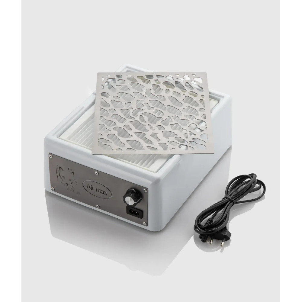 Витяжка для манікюру з фільтром Air Max Pantera  – ця витяжка має відмінні характеристики та продуманий дизайн. Особливістю цієї моделі є можливість застосування як для манікюру, так і для педикюру, адже вона має кріплення для триноги.Особливості :-   має кріплення для триноги, а отже підходить як для манікюру, так і для педикюру;-   відрізняється збільшеною площею для захоплення опилу, а також тихою роботою;-   корпус із щільного пластику з відмінним дизайном;-   німецький двигун, що видає ще менше шуму;-   витяжка оснащена металевою решіткою на магнітах та корейським фільтром.Характеристики-    Потужність 66 вт.-    Німецький двигун.-    Корейська фільтр.-    Втягуюча здатність – 800 куб.м/год.-    Тип: 2 в 1, настільна/педікюрна.-    Розміри: ширина 32 см, довжина 23,5 см, висота 9,5 см.-    Плавний запуск через 4-6 секунд після увімкнення.-    Рівень шуму від 28 до 62 Дб.-    Адаптер вбудований у корпус.-    Фільтр у комплекті 1 шт.-    Гарантія 12 місяців.Як доглядати за фільтром для витяжки     Фільтр не мочити.    Якщо дрібні частинки забиваються у волокно, його рекомендується чистити вузькою щіткою.    За умови повного завантаженого дня фільтра вистачає на 2-3 місяці.