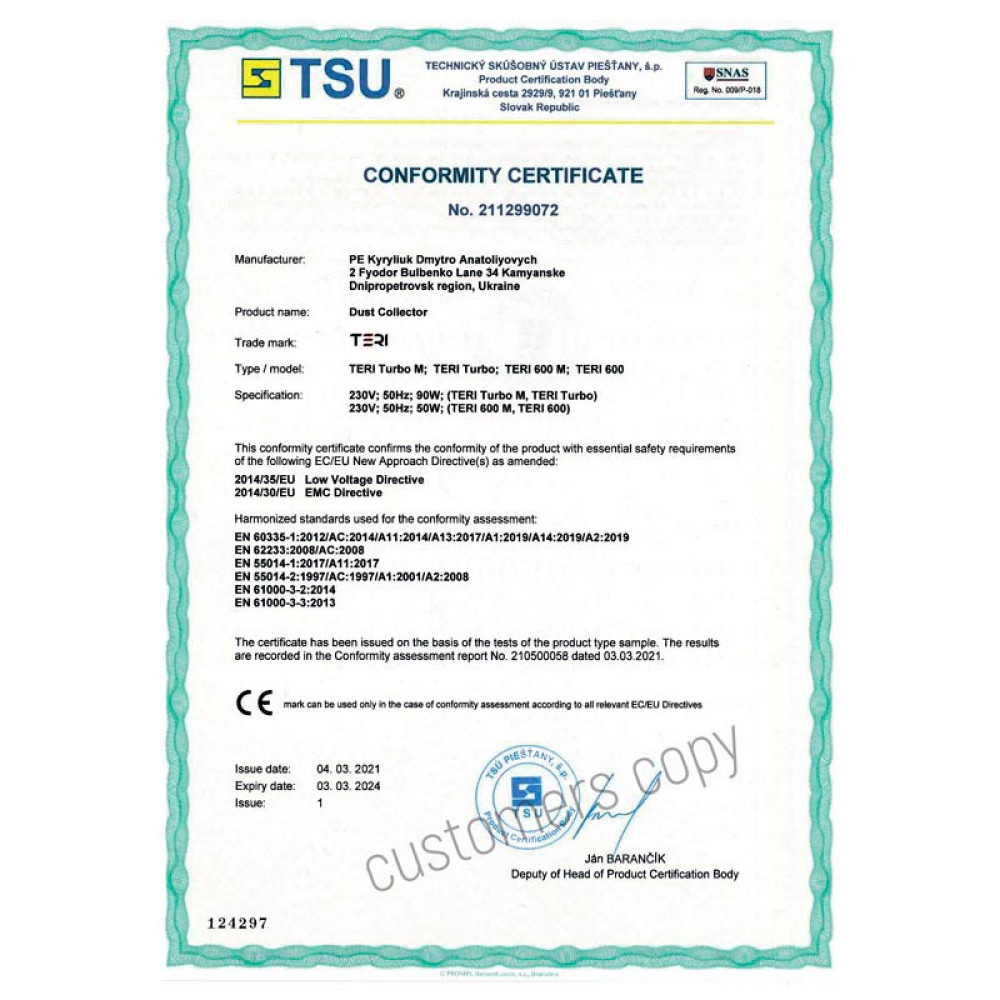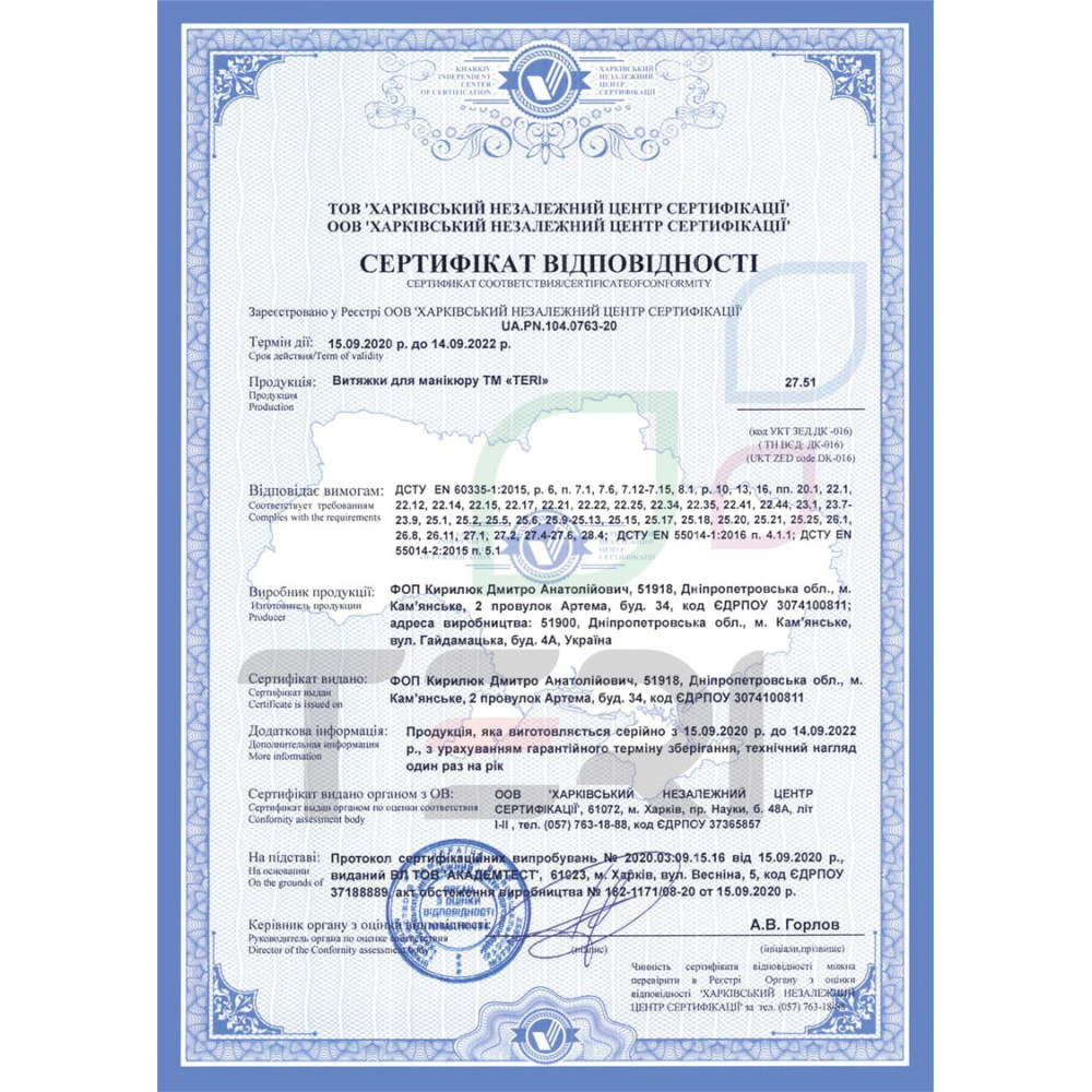 Технічні характеристики:Потужність: 111 ВатТяга (регульована): 3,0 - 5,5 метри за секундуОбороти двигуна: 2600 за хвилинуЕлектроживлення: 230 ВольтРозмір: 322х256х112 мм (ШхГхВ)Шум: 65-75 dBГарантія: 3 роки (тестовий період 14 днів)Комплектація:Витяжка у зборіКабель живленняФірмовий HEPA фільтр TeriІнструкціяГарантійний талонСертифікат СЕС, Сертифікат якості та декларація відповідності