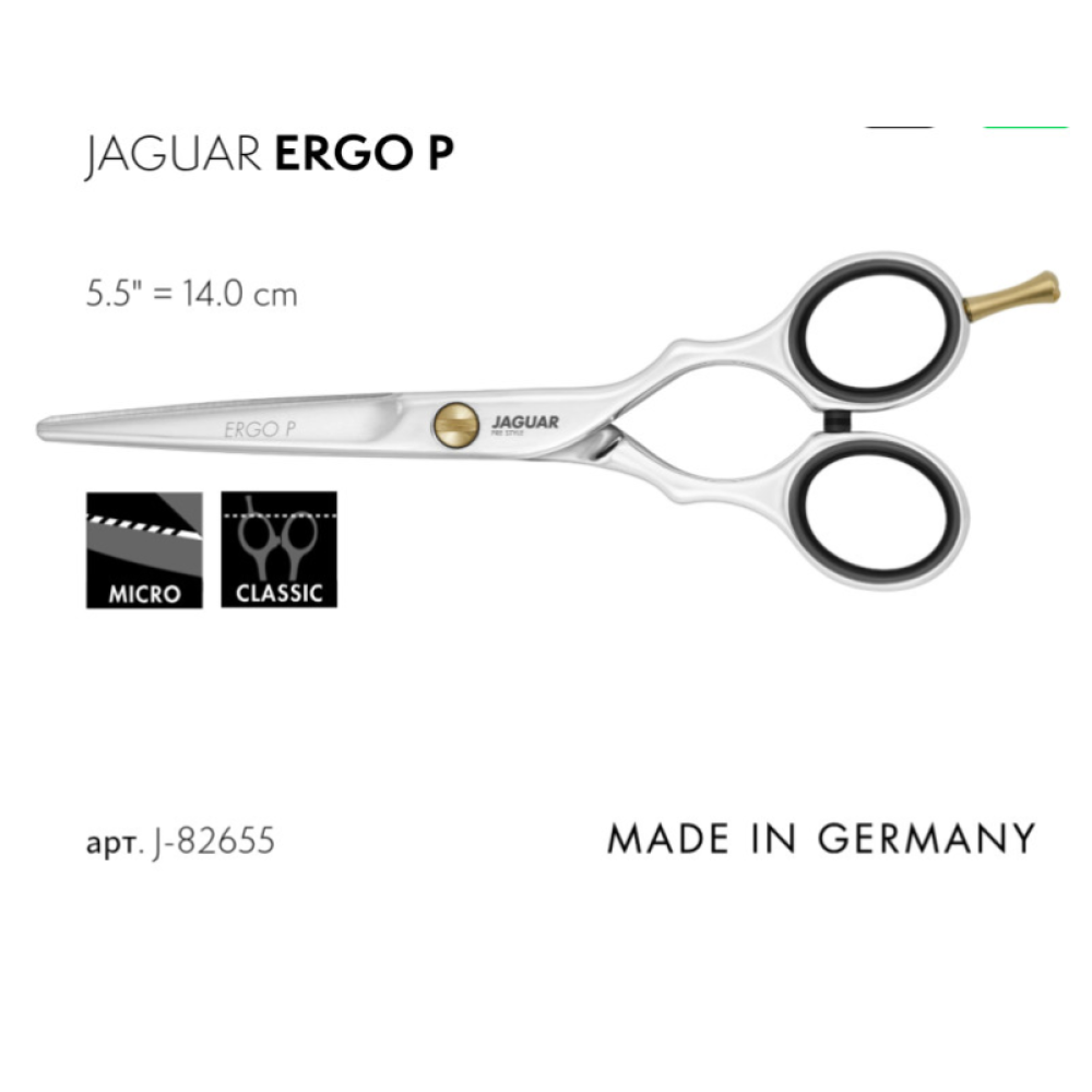Ножиці перукарські Jaguar Pre Style Ergo Polish 5,5” (арт. J-82655)Jaguar Pre Style Ergo Polish — це прямі перукарські ножиці для правші з білим глянцевим покриттям, створені для точного та чистого прямого зрізу. Поєднують німецьку якість, зручну ергономіку та стильний вигляд.Особливості та переваги:    Точний зріз — кут ріжучої кромки 54° та пряма форма леза гарантують ідеальний результат.    Зручність у роботі — класична рукоятка зі знімним упором для пальця забезпечує комфорт навіть під час тривалих стрижок.    Міцна кована сталь — HRC 56/57 забезпечує тривалу гостроту та зносостійкість.    Легке налаштування — гвинтова система Vario дозволяє регулювати натяг полотен під власний стиль роботи.    Стильний вигляд — біле глянцеве покриття додає інструменту елегантності, а прозора упаковка робить його привабливим для презентації.Технічні характеристики:    Розмір: 5,5” (14,0 см)    Клас: Pre Style    Насічка: є    Кут ріжучої кромки: 54°    Контур лінії різу: прямий    Форма леза: пряма    Поверхня: полірована (глянцева)    Гвинтова система: Vario    Колір: білий глянцевий    Упор для пальця: знімний    Виробництво: Німеччина