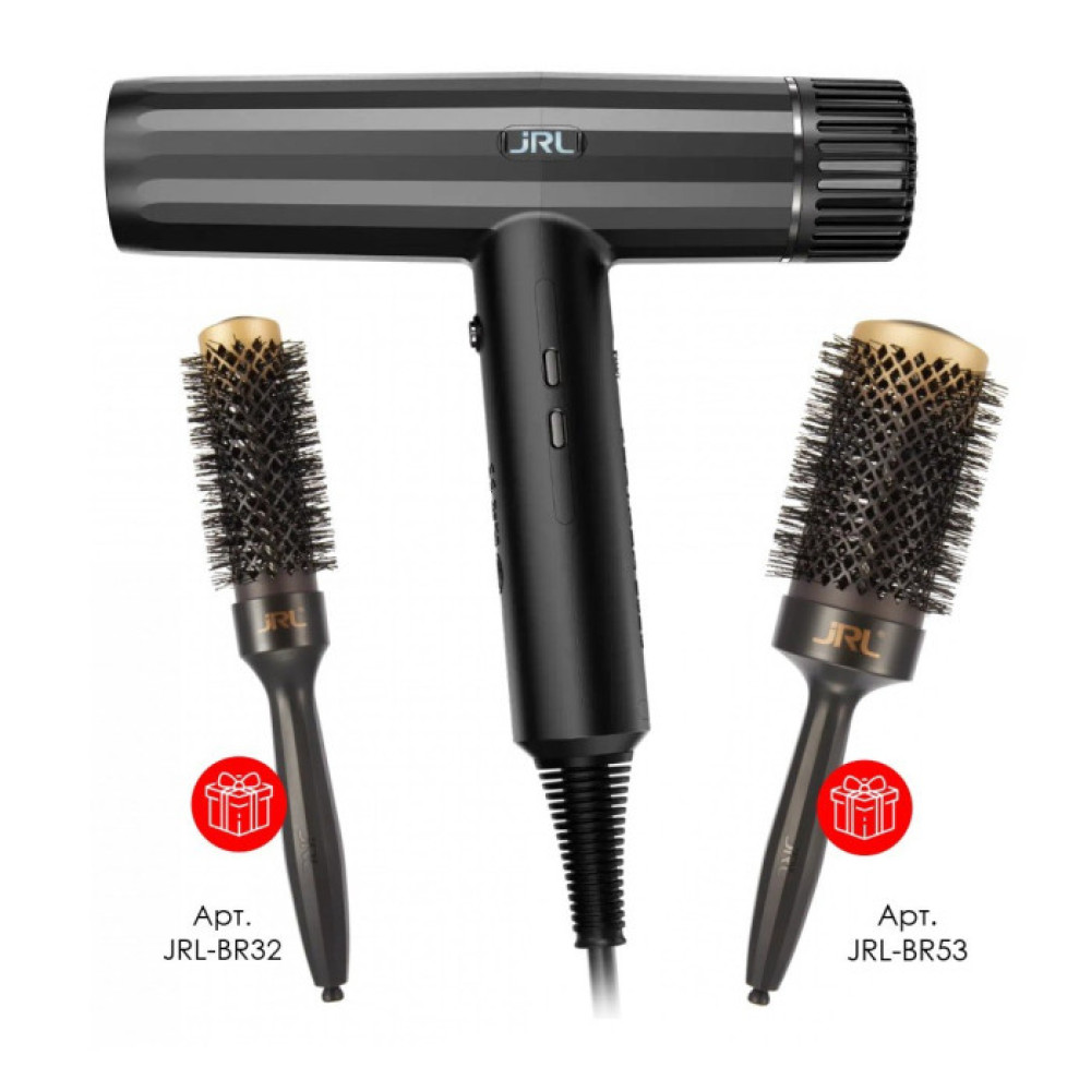 JRL Forte PRO 2150W — професійний фен з США з сучасним дизайномJRL Forte PRO 2150W — це потужний та надійний фен американського бренду, створений для інтенсивної щоденної роботи як у салоні, так і вдома. Поєднання стильного дизайну, інноваційних технологій і легкої ваги робить його ідеальним інструментом для професійного укладання.Потужний мотор і продуктивністьФен оснащений сучасним безщітковим мотором Brushless, який розвиває швидкість до 90 000 об/хв — значно більше, ніж у стандартних моделей. Такий двигун відзначається довгим терміном служби та стабільною роботою навіть при постійному навантаженні.Максимальна потужність — 2150 Вт. Працює від мережі 220–240 В, 50–60 Гц.Температурні та швидкісні режимиJRL Forte PRO має 3 режими швидкості та 3 температурні налаштування, що дозволяє легко підібрати оптимальний режим для будь-якого типу волосся та стилю укладання. Фен забезпечує швидке, ефективне та безпечне сушіння без шкоди для структури волосся.Іонізація та захист волоссяТехнологія іонізації генерує негативні іони, які:зменшують статичну електрикузапобігають пересушуваннюзберігають природну вологу волоссяУ результаті волосся стає гладким, блискучим і доглянутим, а час сушіння скорочується без втрати якості.Ергономіка та комфорт у роботіПродуманий дизайн дозволяє зручно тримати фен у будь-якому положенні, знижуючи навантаження на кисті. Модель оснащена:LED-індикатором температурисистемою самоочищення та глибокого очищення фільтрівзнімними фільтрами, які можна мити водоюВага фена — лише 320 г, а поворотний шнур довжиною 3,5 м забезпечує максимальну свободу рухів під час роботи.Комплектація У наборі:фен JRL Forte PRO 2150W2 насадки-концентраторидифузорщітка для очищеннясупровідна документаціяГарантія — 12 місяцівКлючові характеристики:Потужність: 2150 ВтШвидкість мотора: 90 000 об/хв3 режими швидкості3 температурні режимиДуже тихий у роботіМийні фільтриLED-індикатор температуриТермобрашинги JRL Mixed Bristle Brush (32 мм та 53 мм)Професійні термобрашинги JRL Mixed Bristle Brush — ідеальний вибір для створення стильних і довговічних укладок. Завдяки кераміко-іонній технології вони рівномірно розподіляють тепло, знижують статичну електрику та захищають волосся від пересушування.