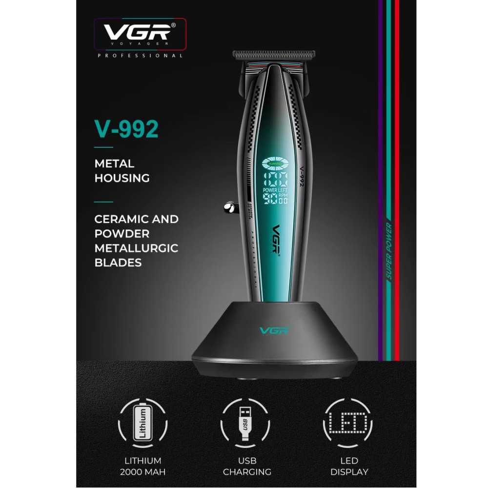 Тример VGR V-992 - професійний акумуляторний тример, призначений для стрижки волосся та догляду за бородою. Ергономічний дизайн та потужні характеристики роблять його ідеальним вибором як для домашнього використання, так і для професіоналів.Основні характеристики: Швидкість обертання двигуна: 9000 об/хв Низький рівень шуму Місткість акумулятора: 2000 мА·ч Час роботи від акумулятора: до 240 хвилин Час заряджання: 2,5 години Тип акумулятора: Li-Ion Тип живлення: акумуляторне та мережеве Леза з керамічним покриттям Індикатор заряду: LED-дисплейКомплектація: Тример VGR V-992 3 насадки (1 мм, 2 мм, 3 мм) Кабель для заряджання Платформа для заряджання Щітка для очищення Інструкція з експлуатації Фірмова упаковка