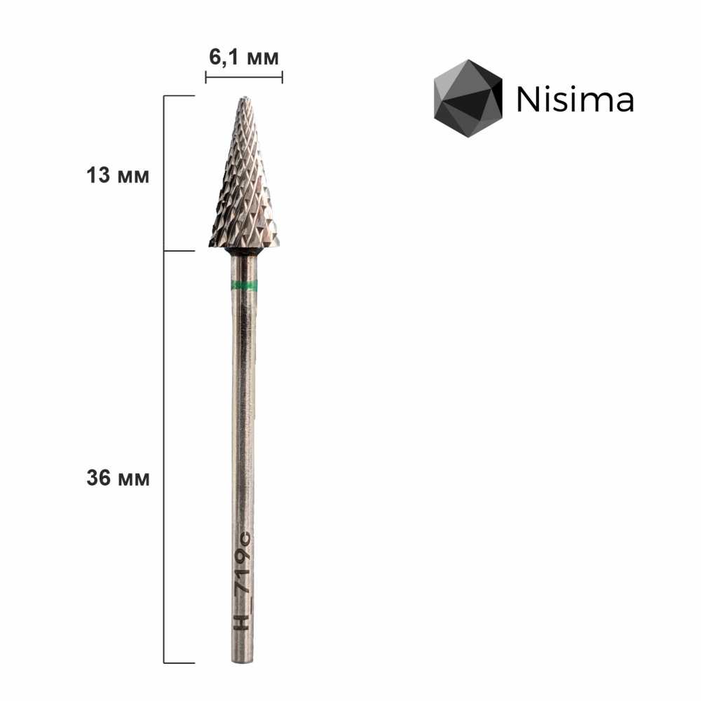 Професійна твердосплавна фреза NISIMA H_719cK у формі «гострий конус» діаметром 6,1 мм із зеленим жорстким абразивом призначена для швидкого та точного зняття товстих шарів гелю, акрилу та інших штучних матеріалів під час корекції та моделювання нігтів. Фреза забезпечує агресивне, але контрольоване спилювання, дозволяє ефективно видаляти надлишки матеріалу у важкодоступних зонах, працює плавно без вібрацій і перегрівання, скорочує час процедури, а високоякісний твердосплавний матеріал гарантує довготривалу гостроту, зносостійкість і стабільну продуктивність навіть при інтенсивному професійному використанні в манікюрі та педикюрі.