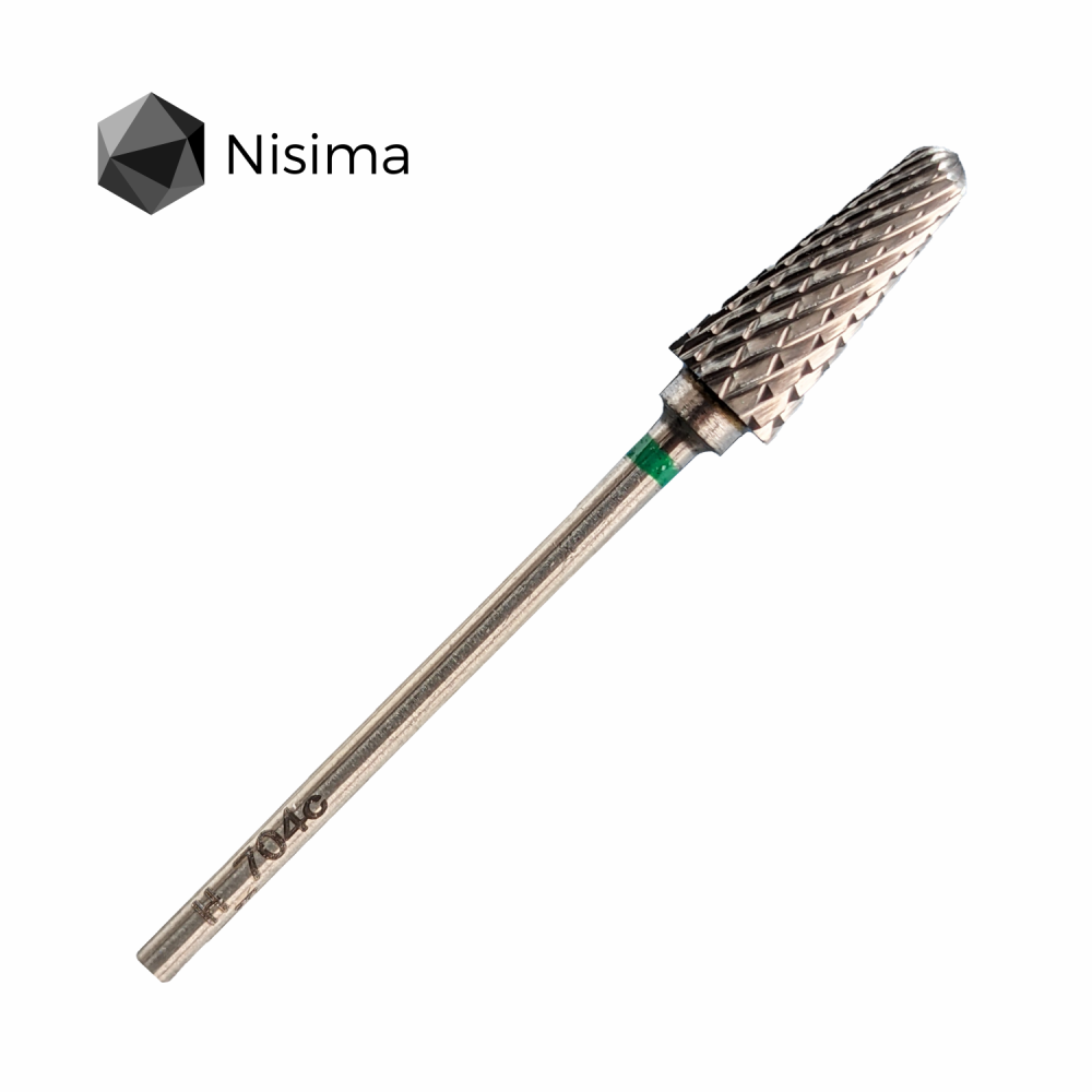 Професійна твердосплавна фреза NISIMA H_704cK у формі «конус із рівними боками» діаметром 6 мм із зеленим жорстким абразивом призначена для швидкого та ефективного зняття товстих шарів гелю, акрилу й інших штучних матеріалів під час корекції та моделювання нігтів. Фреза забезпечує агресивніше та контрольоване спилювання без зайвого тиску, скорочує час процедури, працює без надмірних вібрацій і перегрівання, зберігає стабільну продуктивність навіть при інтенсивному використанні, а високоякісний твердосплавний матеріал гарантує довготривалу гостроту, зносостійкість і надійність, що робить інструмент ідеальним вибором для професійного манікюру та педикюру.