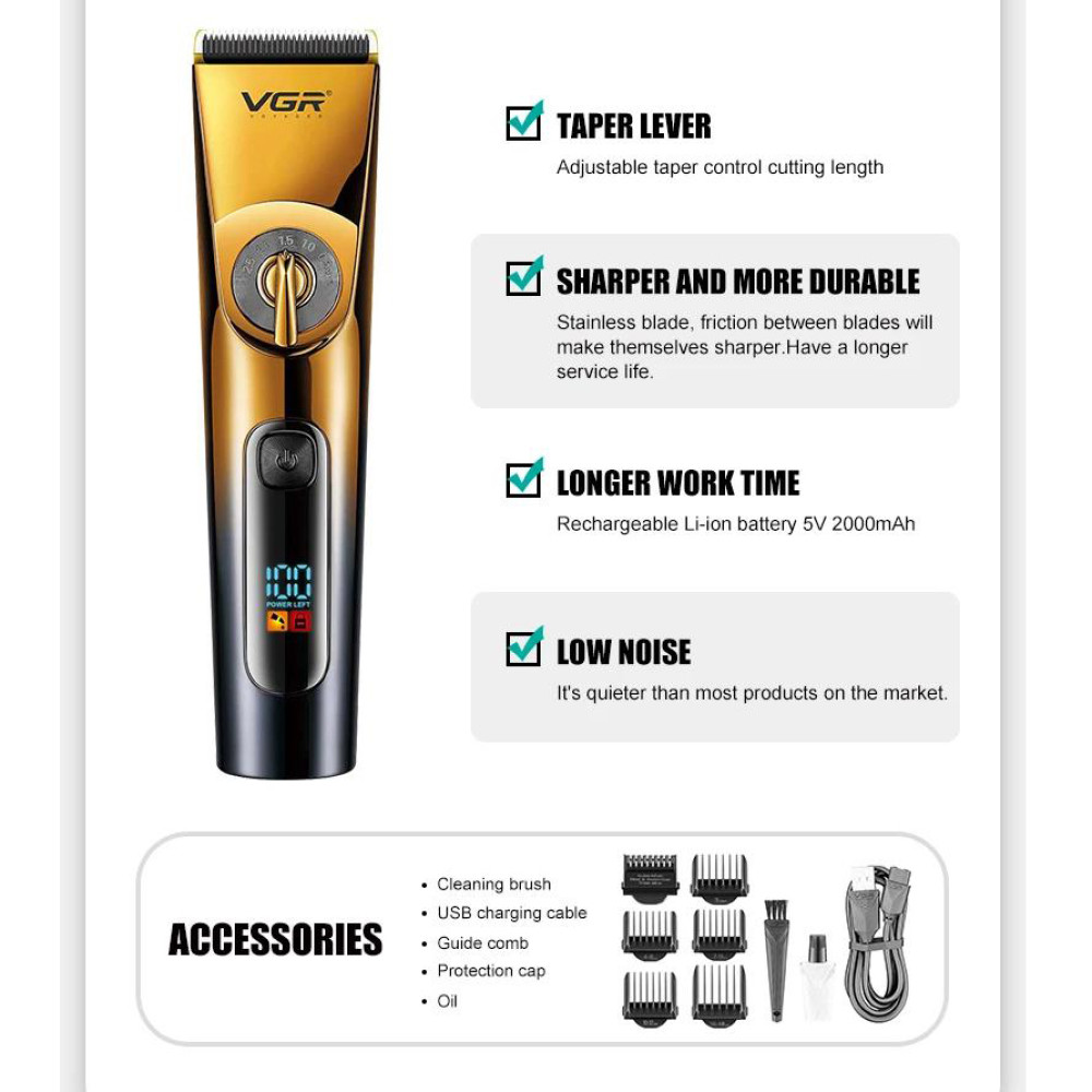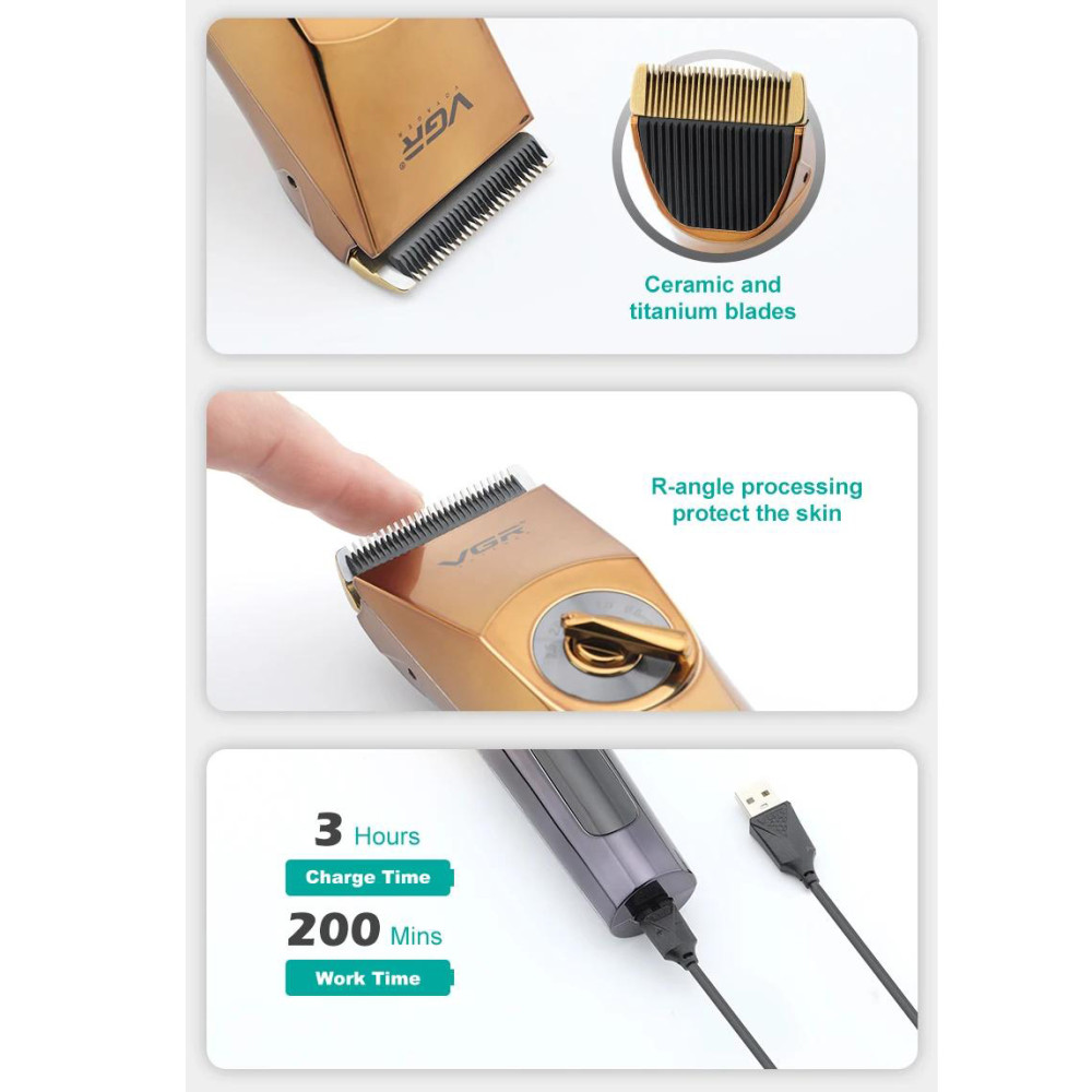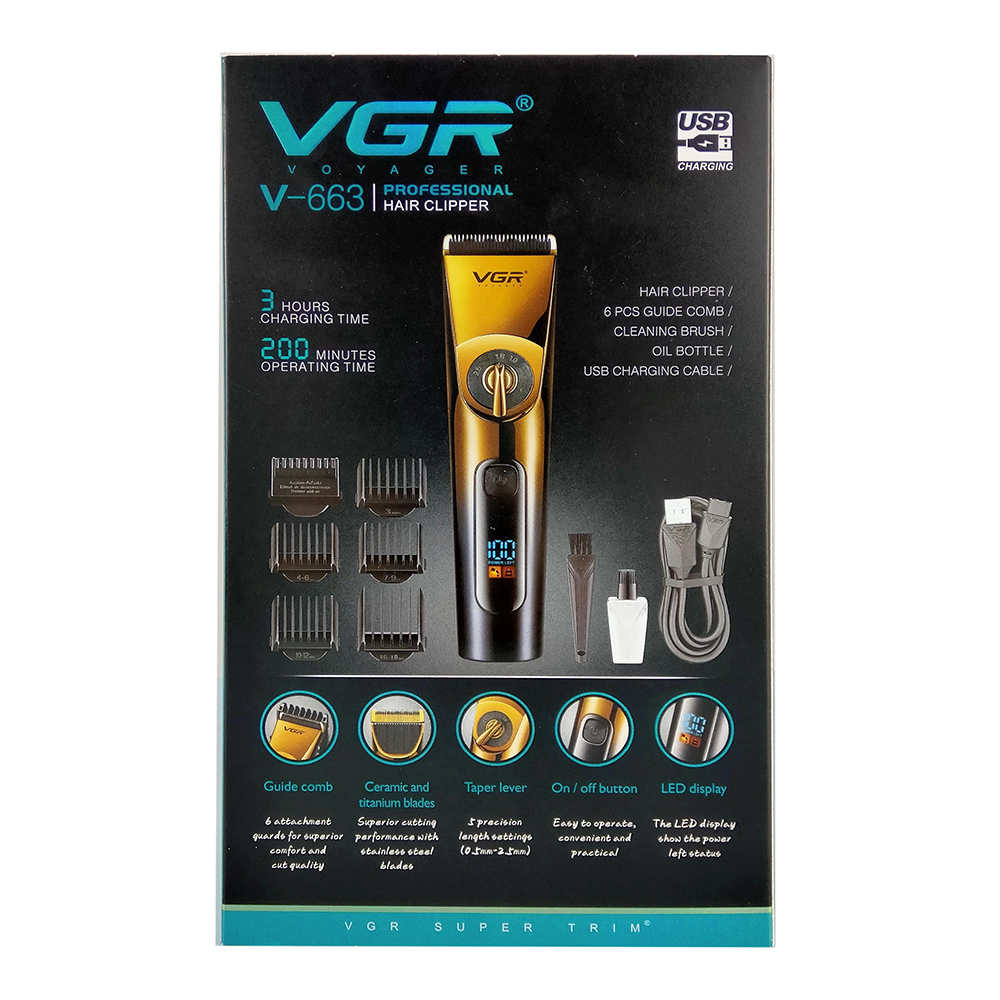 VGR V-663 - це бездротова акумуляторна машинка для стрижки волосся і бороди з футуристичним дизайном і фантастичною точністю зрізу. У машинці зійшлося воєдино все необхідне для ідеальної стрижки: ніж зі сталі шириною 45 мм і висотою зрізу 0.5 мм, літій іонний акумулятор, збільшений час автономної роботи до 200 хвилин і LCD дисплей .Переваги: Акумуляторно-мережевий тип живлення дозволяє використовувати машинку для стрижки клієнта після повної розрядки акумулятора; Комплектується 5-ма насадками довжиною 3/4-6/7-9/10-12/16-18 мм; Регулювання довжини леза від 0.5 до 2,5 мм .Характеристики: Виробник: VGR ; Модель: V-663 ; LED дисплей із індикатором заряду акумулятора; Ширина ножа: 45 мм ; Час повної зарядки: 3:00; Час роботи від акумулятора при повному заряді: 200 хвилин ; Місткість акумулятора: 2000 mAh ; Ступінь вологозахисту: IPX6 ; Змінні насадки: 3/4-6/7-9/10-12/16-18 мм; Регулювання зрізу лез: 0.8/1.4/2.0 мм; Колір: Чорний із золотим.Комплектація: Машинка для стрижки VGR V-663 ; Змінні насадки: 5 штук (3/4-6/7-9/10-12/16-18 мм); Олія для змащування лез; Щіточка для очищення; USB кабель для зарядки (є можливість заряджати машинку в автомобілі або від Power Bank); Інструкція (англійською мовою); Фірмова заводська упаковка.