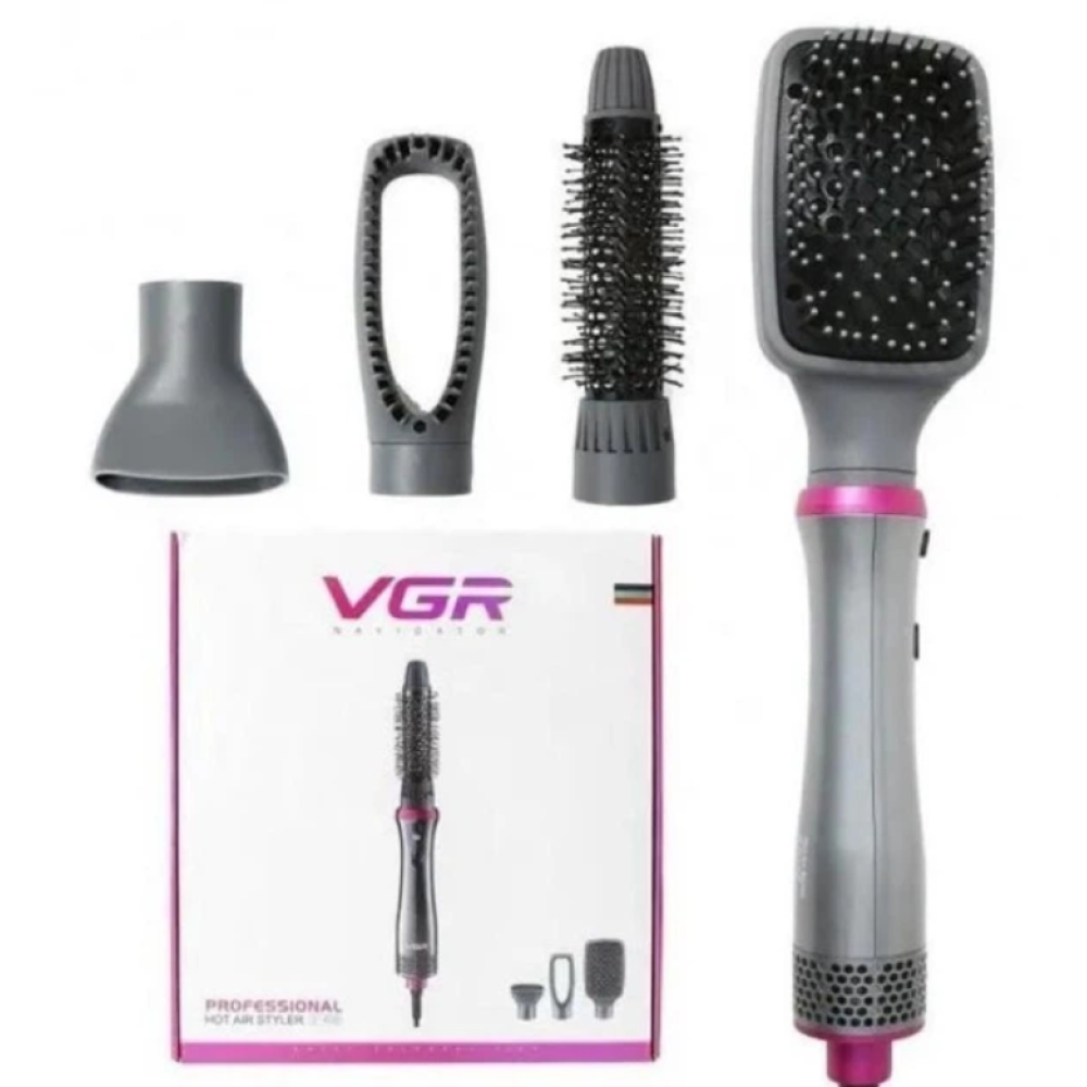 VGR V-408 — це багатофункціональний фен-стайлер (мультистайлер) для волосся типу «4 в 1», який поєднує в собі функції фена, гребінця та плойки.Основні характеристики:    Потужність: 700–800 Вт (оптимально для укладки без пересушування).    Насадки (4 шт.):      -  Концентратор — для швидкого сушіння.      -  Гребінь для випрямлення — для розчісування та розгладжування.      -  Кругла щітка (браш) — для створення об'єму та підкручування кінчиків.      -  Насадка для локонів — для завивки.    Покриття: Керамічне (забезпечує рівномірне нагрівання та захищає волосся).    Режими: 2 рівні температури та швидкості + режим подачі холодного повітря для фіксації зачіски.    Функції: Іонізація (знімає статичну електрику, робить волосся блискучим).    Шнур: Обертається на 360 градусів, що запобігає заплутуванню.Переваги моделі:    Універсальність: Замінює кілька окремих приладів для догляду за волоссям.    Ергономіка: Легкий корпус та зручна зміна насадок однією кнопкою.    Бережний догляд: Завдяки іонізації та кераміці мінімізує пошкодження структури волосся.