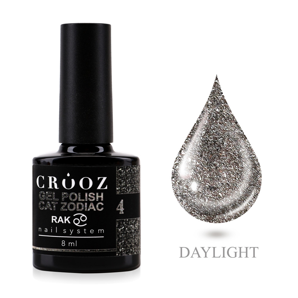 Гель-лак Crooz Cat Zodiac №04 Rak у відтінку сріблясто-сірий створює стильний і сучасний манікюр із ефектом «Котяче око», який переливається при зміні кута освітлення, підкреслює форму нігтів і виглядає ефектно як у класичному покритті, так і в дизайнерських варіантах, рівномірно наноситься без смуг і просвітів, має щільну пігментацію та комфортну самовирівнювальну консистенцію, не розтікається під час роботи, забезпечує насичений колір і чіткий магнітний ефект уже з 1–2 шарів, швидко полімеризується в LED/UV-лампі, зберігає блиск і стійкість до 3–4 тижнів без сколів та відшарувань, підходить для професійного та домашнього використання.