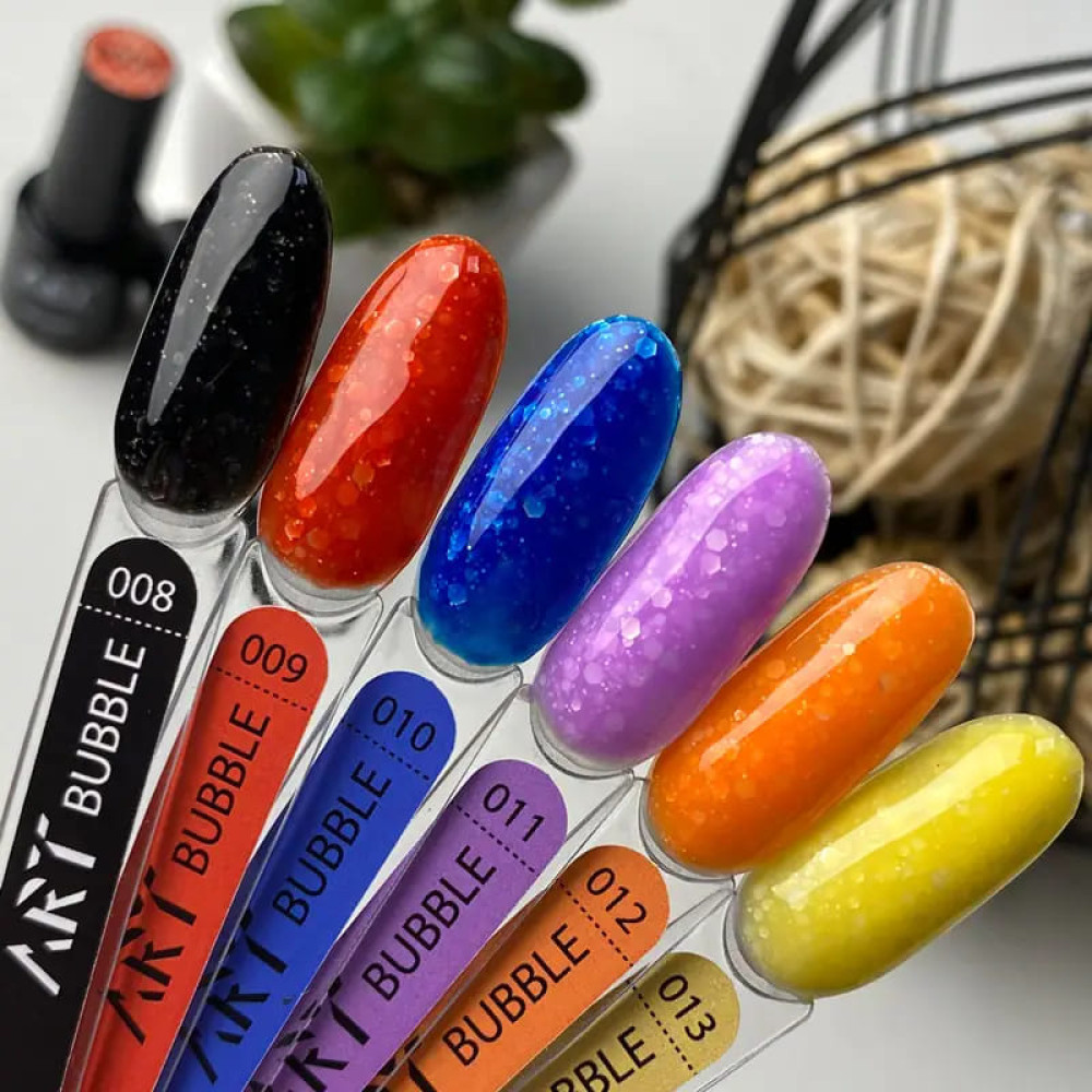 Гель-лак напівпрозорий з пластівцями ART Bubble.Гель-лак із пластівцями різного розміру на прозорій основі.Пластівці мають матовий фініш.