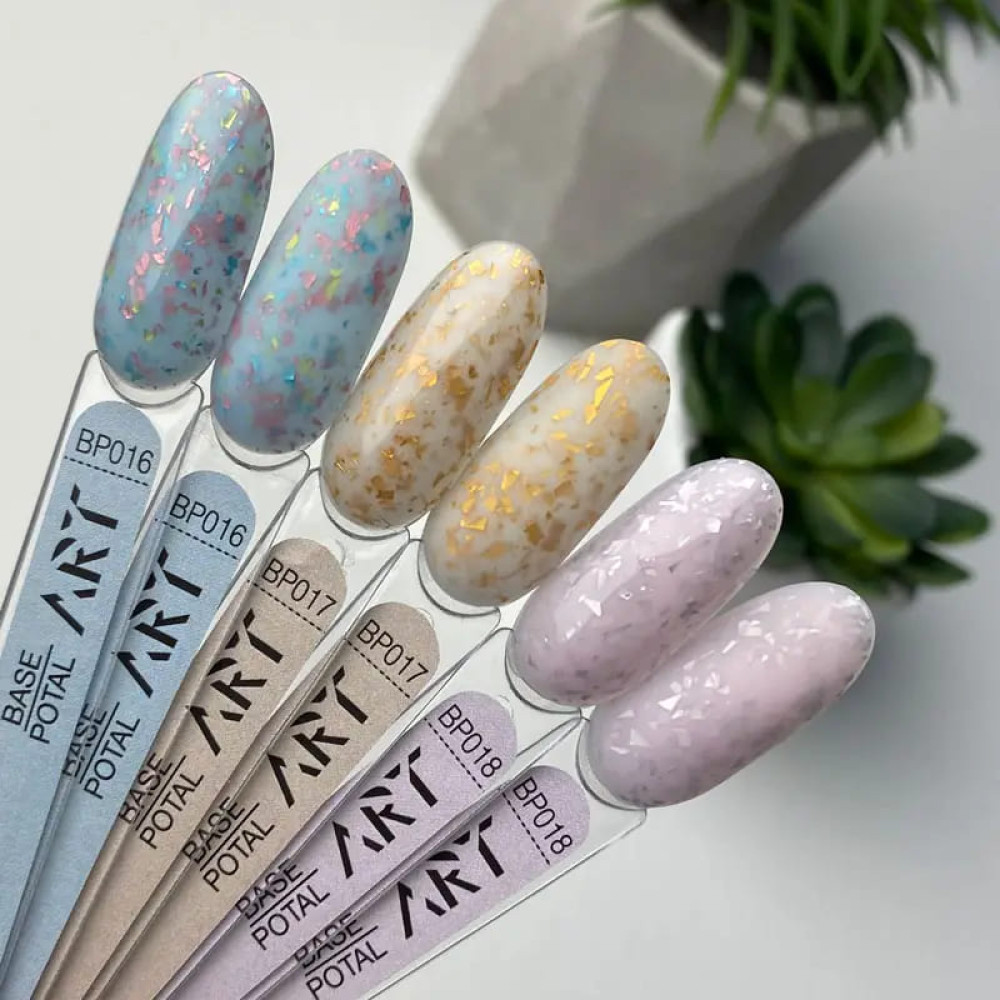 База для нігтів із поталлю ART Potal Base.Базове покриття для нігтів із шматочками поталі.Поталь делікатна та тонка, тому не потребує опилу.Середньої густоти, самовирівнюється.Має високу пігментацію.Об'єм: 10 мл.