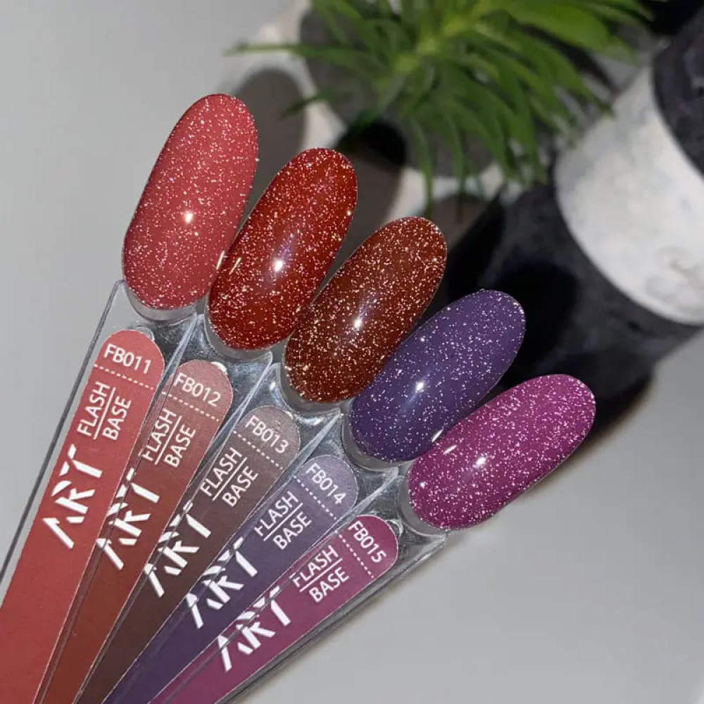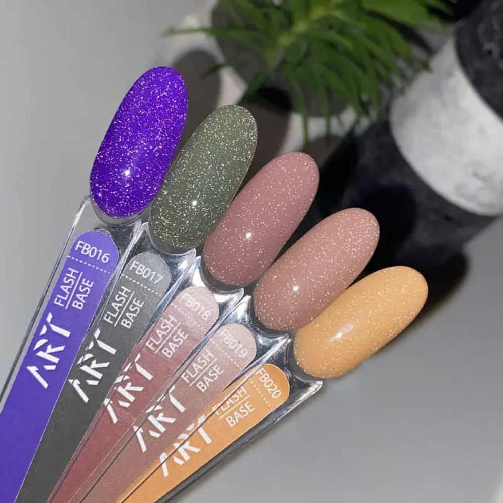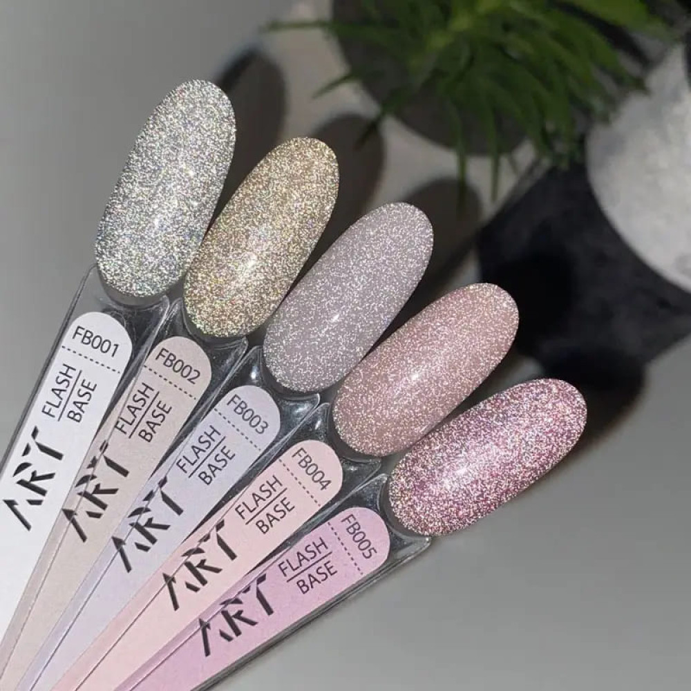База для нігтів світловідбивна ART Flash Base.Базове покриття для нігтів зі світловідбивним ефектом.Пластична, середньої густоти база.Добре вирівнює, зміцнює натуральні нігті.Бажано наносити на підложку із каучукової бази.Об'єм: 10 мл.