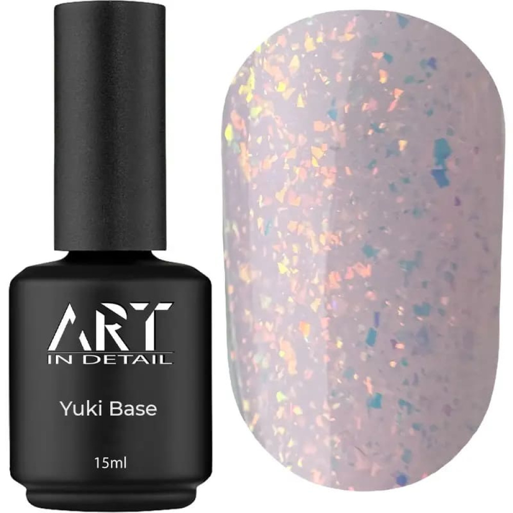 База для нігтів із пластівцями ART Yuki Base.Базове покриття для нігтів із сяючими пластівцями.Середньої густоти, самовирівнюється.Не мутніє та не сколюється.5 універсальних відтінків.Об'єм: 15 мл.