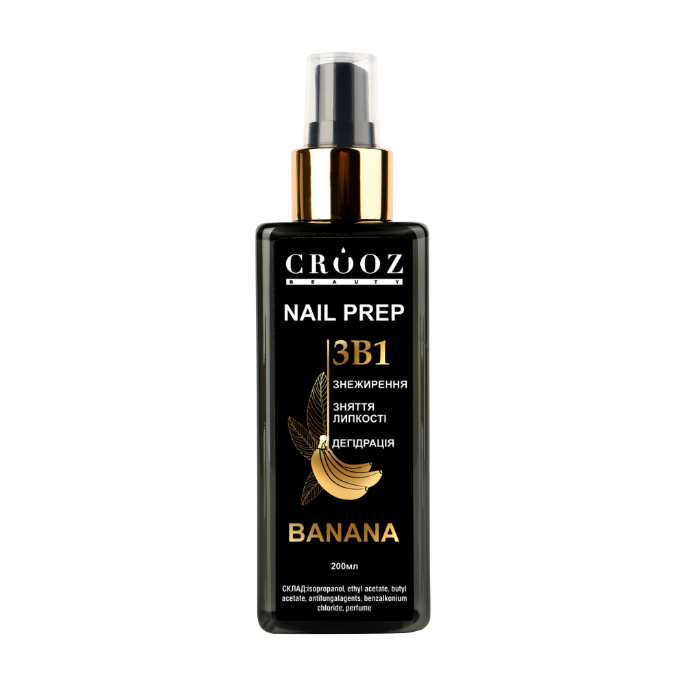 CROOZ NAILS PREP 3В1 - універсальний засіб для якісної підготовки нігтьової пластини перед нанесенням гель лаку чи моделюванням, а також для завершення манікюру.Використовується в 3 етапах:1. Знежирення - прибирає жирність та вологість з нігтьової пластини.2. Дезинфекція - видаляє залишки бруду для нанесення більш якісного манікюру та забезпечує антисептичний ефект, що перешкоджає розвитку інфекцій та оберігаючи ніготь від розмноження бактерій.3. Зняття липкого шару - щоб якісно завершити процес, прибираємо залишкову липкість з фінішного покриття.Особливості:- Використовуйте засіб для всіх манікюрних процедур, це дасть змогу зміцнити нігтьову пластину, відновити її здоровʼя, а також значно продовжити тривалість носіння манікюру.- Наділений ніжним ароматом соковитого банану.- Завдяки універсальності продукту, економиться час на проведення процедур.