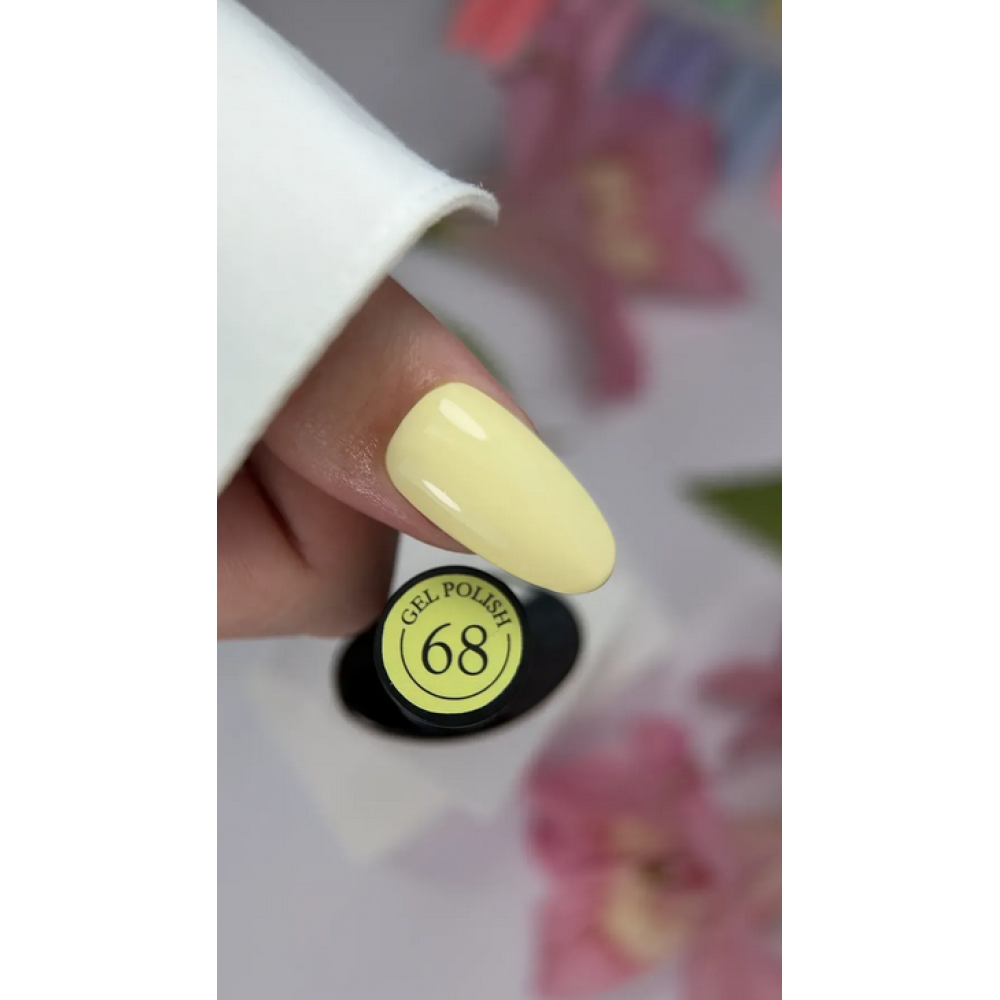 Crooz Гель-лак №68 — яскравий сонячно-лимонний відтінок, що створює свіжий, енергійний та позитивний манікюр із ефектом легкого літнього настрою; колір виглядає соковито та виразно, додає образу світла, тепла й акцентності, ідеально підходить для сезонних дизайнів та сміливих рішень; формула має консистенцію середньої щільності, рівномірно наноситься без розтікання, добре самовирівнюється та забезпечує чисте покриття без смуг і пропусків; завдяки високій пігментації перекривається у 1–2 тонкі шари, зберігаючи яскравість і чистоту відтінку; покриття стійке у носінні, довго тримає глянцевий блиск і не тьмяніє; зручний пензлик дозволяє точно працювати біля кутикули та бічних валиків, забезпечуючи акуратний і професійний результат.