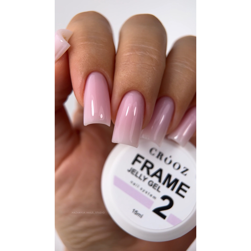 Гель Crooz Frame Jelly Gel №02 — це професійний трьохфазний гель із густою желеподібною консистенцією, який поєднує максимальну міцність і повний контроль у роботі, має високі показники в’язкості, твердості та жорсткості (5/5), не розтікається та чудово тримає форму й арку, завдяки вираженим тиксотропним властивостям дозволяє працювати без поспіху та точно викладати матеріал, ідеально підходить для нарощування на верхні та нижні форми, складної корекції, укріплення, ремонту та відновлення архітектури нігтів, забезпечує міцність у товщині від 1 мм і пластичність у тонкому шарі, комфортний у полімеризації без сильного печіння, дозволяє добудовувати кути та вільний край без шаблонів і працювати в техніці «по повітрю», потребує підкладки з адгезивної бази та перекриття топом, ідеально підходить для професійного використання, гарантуючи довговічний результат і бездоганну геометрію нігтів без відшарувань.