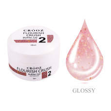 Гель для нарощування Crooz Flourish Crush Builder Gel №02 — пастельно-персиковий напівпрозорий відтінок з холодним підтоном, ніжними білими та жовтими частинками і делікатними золотими вкрапленнями, що створює легкий романтичний ефект «ранкового неба..