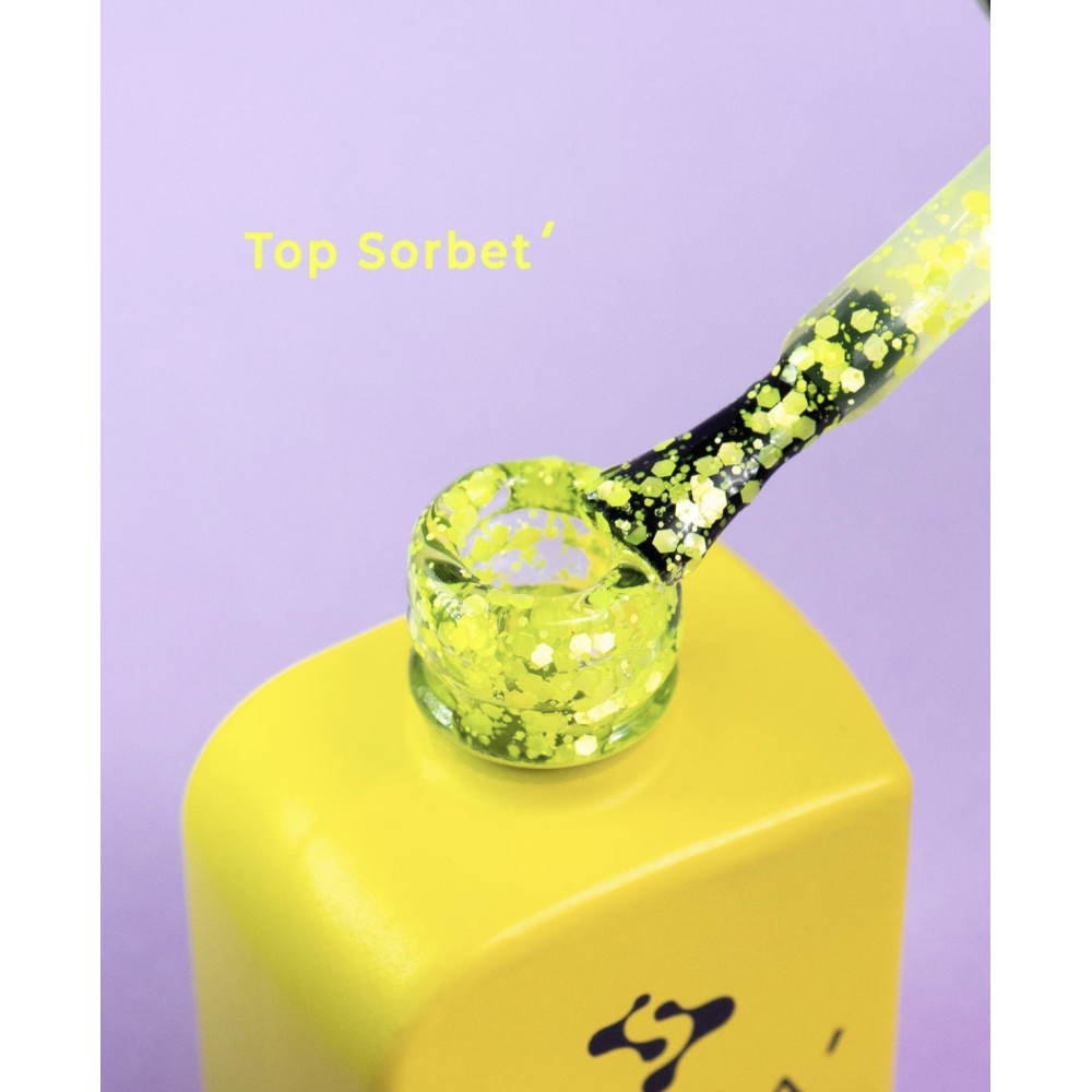 Топ для нігтів із пластівцями без липкого шару DNKa Sorbet Top 12 мл.глянсове покриття;середня консистенція;без липкого шару;не жовтіє;швидко самовирівнюється;Об'єм: 12 мл.