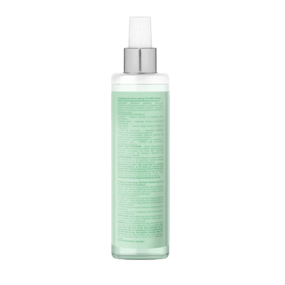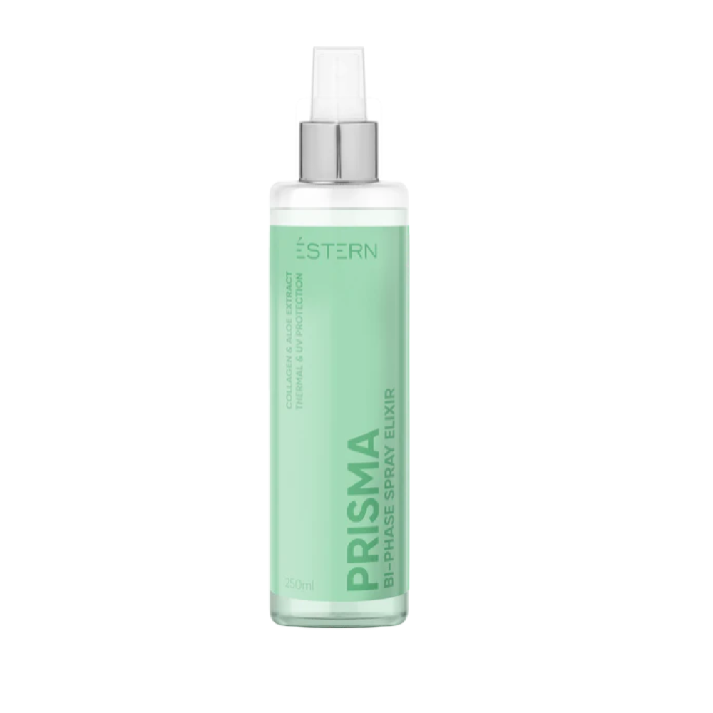Estern Prisma Bi-Phase Spray Elixir — двофазний незмивний спрей-еліксир, що повертає волоссю м’якість, блиск і доглянутий вигляд. Формула поєднує зволожувальну водну фазу та поживну олійну, забезпечуючи одночасно розгладження, живлення та захист без ефекту обтяження.Колаген зміцнює структуру волосся та підвищує його еластичність. Екстракт алое зволожує та тонізує, підтримуючи комфорт шкіри голови. Олія аргани додає м’якості та природного сяйва. UV-фільтри захищають колір від вигоряння й допомагають зберегти чистоту відтінку. Спрей полегшує розчісування, зменшує пухнастість і підходить для щоденного використання.Спосіб застосування: перед використанням добре струсіть флакон до повного змішування фаз. Розпиліть засіб на сухе або підсушене рушником волосся, уникаючи кореневої зони. Не змивайте. Підходить для щоденного догляду та для підготовки волосся до укладання.