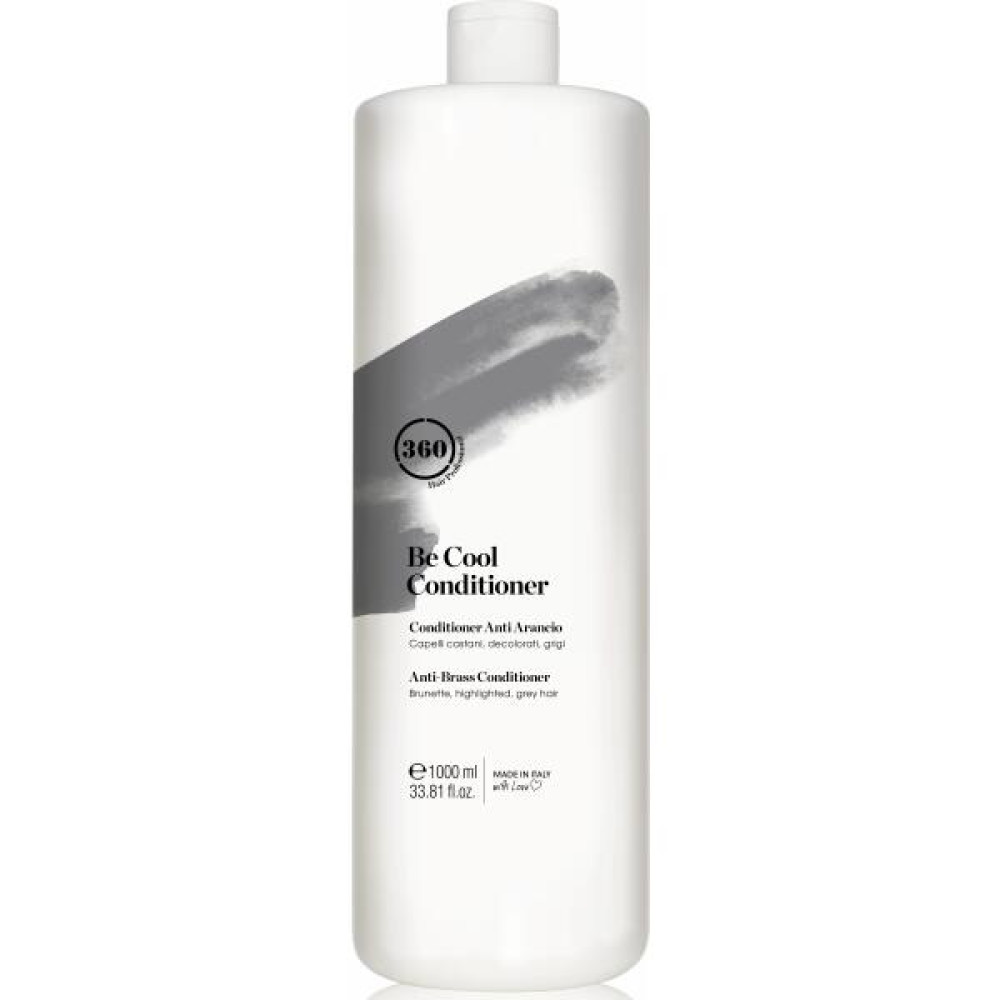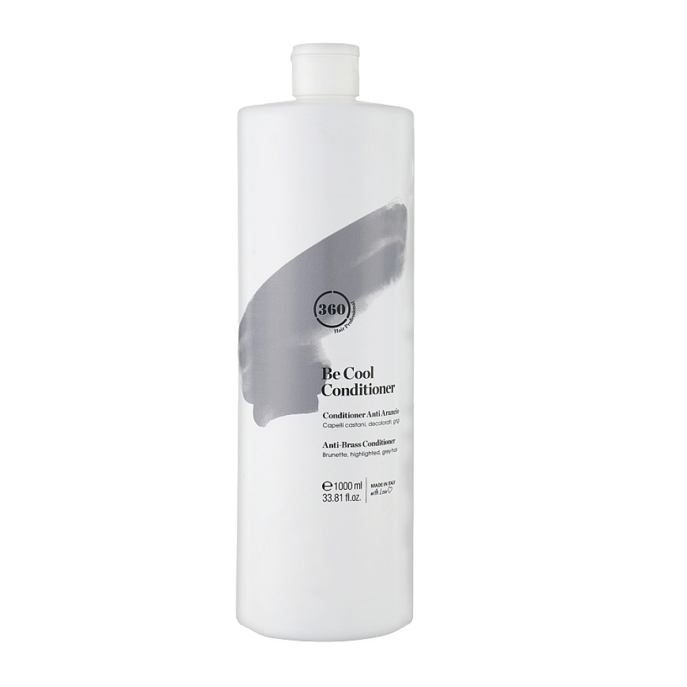 360 BE COOL Кондиціонер — тонуючий догляд для темного, освітленого або сивого волосся, який допомагає нейтралізувати небажані теплі відтінки, освіжити тон і підтримати холодну гамму кольору між миттями. Його спеціальна формула без парабенів дбайливо живить і зволожує волосся, робить локони більш слухняними, м’якими і блискучими без обтяження, а також полегшує розчісування й укладку. Кондиціонер вирівнює колір, підкреслює холодні відтінки та підтримує доглянутий вигляд волосся, забезпечуючи тривалий тонуючий ефект у домашньому чи професійному догляді.