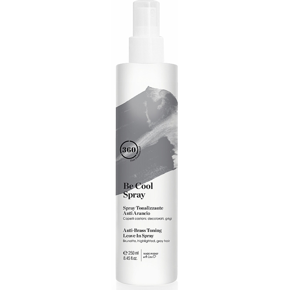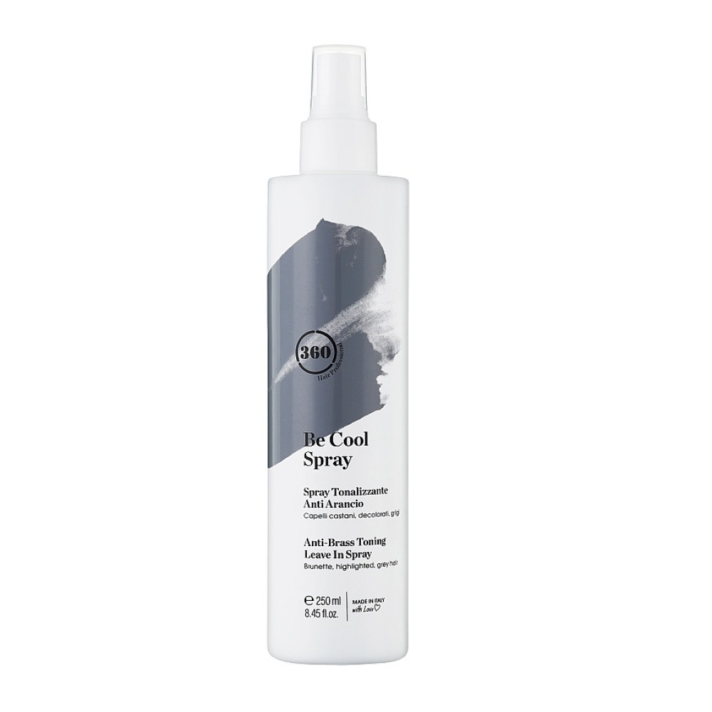 360 BE COOL Спрей — тонуючий засіб, який одночасно нейтралізує небажані теплі відтінки на темному, освітленому або сивому волоссі та полегшує розплутування пасм. Легка беззмивна формула рівномірно розподіляється по довжині, живить і зволожує волосся, роблячи локони більш слухняними, м’якими і блискучими без обтяження. Спрей допомагає підтримувати холодний тон між миттями, вирівнює структуру волосся, полегшує розчісування та укладку, забезпечуючи доглянутий вигляд і тривалий тонуючий ефект у домашньому чи професійному догляді.