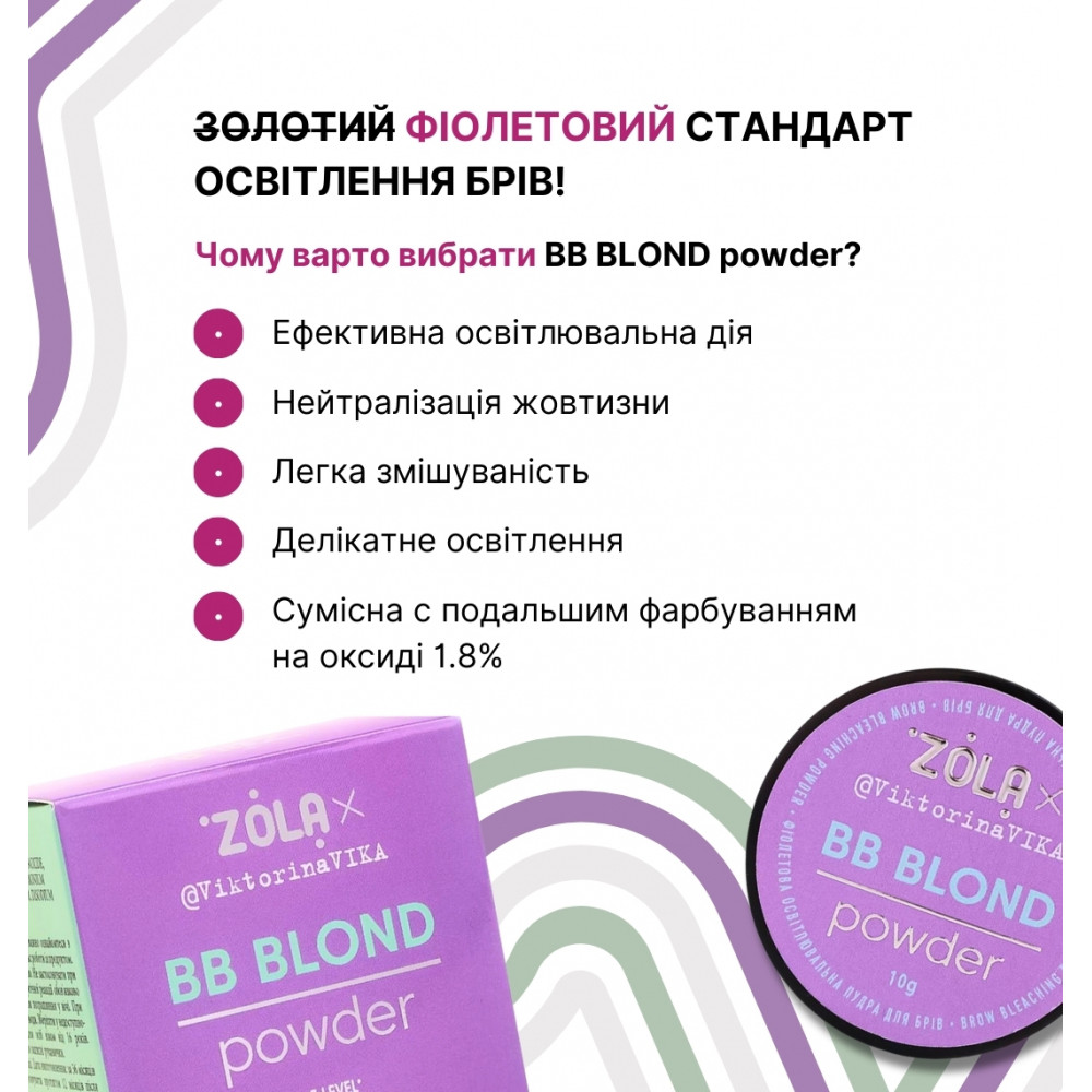 BB Blond Powder — професійна фіолетова пудра для освітлення брів.Під час змішування з окислювачем (3%) утворює однорідну кремоподібну консистенцію, яка легко розподіляється по волосках і не розтікається.Пудра BB Blond має делікатну дію, рівномірно і м/'яко освітлює натуральні або пофарбовані волоски завдяки спеціальним фіолетовим пігментам, які входять до складу, нейтралізує небажану жовтизну.Продукт виключно для професійного використання!