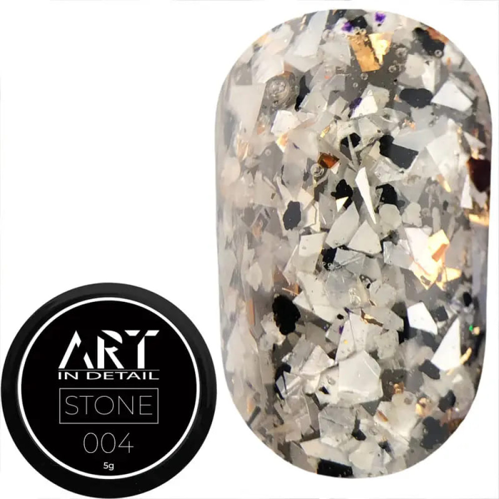 Гель для дизайну нігтів ART Stone Gel.Декоративний гель для нігтів надзвичайної краси - мають напівпрозору основу та різноманітні частинки фольги, слюди, мушлів.Об'єм: 5 мл.