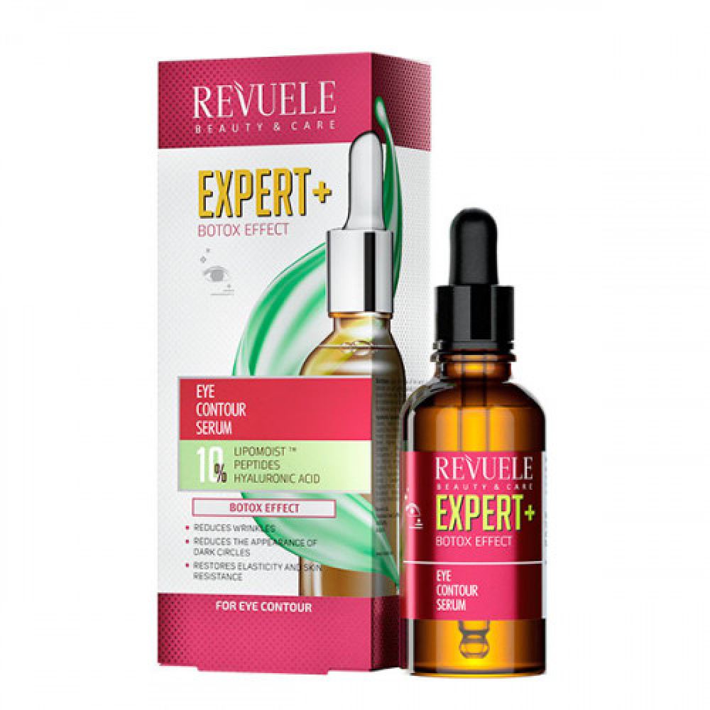 Сироватка для шкіри навколо очей Revuele Expert+ Botox Effect стане чудовим доповненням до вашого улюбленого крему, коли вам здається, що звичайного догляду за зоною навколо очей недостатньо. Вона потішить шкіру навколо очей та забезпечить її інтенсивним доглядом. Завдяки високій концентрації активних речовин її дія на шкіру буде в рази сильнішою і швидшою, ніж у крему для очей або звичайного крему для шкіри.Властивості:знімає набряклість та темні круги під очимавідновлює пружність шкірирозгладжує зморшки та тонкі лініїнадає шкірі свіжого та відпочилого виглядумає ефект ліфтингуСпосіб використання:Наносіть на очищену ділянку навколо очей, ніжно постукуючи кінчиками пальців.