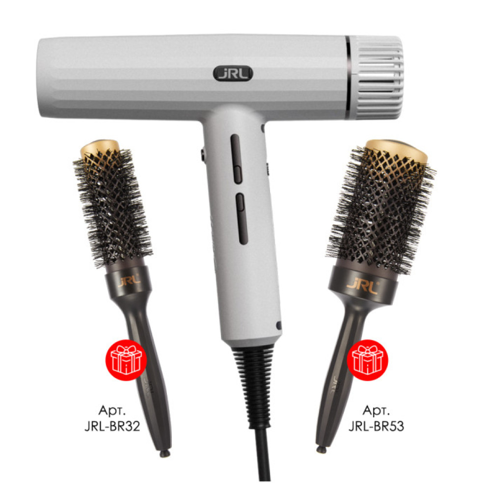 JRL Forte PRO 2150W — професійний фен з США з сучасним дизайномJRL Forte PRO 2150W — це потужний та надійний фен американського бренду, створений для інтенсивної щоденної роботи як у салоні, так і вдома. Поєднання стильного дизайну, інноваційних технологій і легкої ваги робить його ідеальним інструментом для професійного укладання.Потужний мотор і продуктивністьФен оснащений сучасним безщітковим мотором Brushless, який розвиває швидкість до 90 000 об/хв — значно більше, ніж у стандартних моделей. Такий двигун відзначається довгим терміном служби та стабільною роботою навіть при постійному навантаженні.Максимальна потужність — 2150 Вт. Працює від мережі 220–240 В, 50–60 Гц.Температурні та швидкісні режимиJRL Forte PRO має 3 режими швидкості та 3 температурні налаштування, що дозволяє легко підібрати оптимальний режим для будь-якого типу волосся та стилю укладання. Фен забезпечує швидке, ефективне та безпечне сушіння без шкоди для структури волосся.Іонізація та захист волоссяТехнологія іонізації генерує негативні іони, які:зменшують статичну електрикузапобігають пересушуваннюзберігають природну вологу волоссяУ результаті волосся стає гладким, блискучим і доглянутим, а час сушіння скорочується без втрати якості.Ергономіка та комфорт у роботіПродуманий дизайн дозволяє зручно тримати фен у будь-якому положенні, знижуючи навантаження на кисті. Модель оснащена:LED-індикатором температурисистемою самоочищення та глибокого очищення фільтрівзнімними фільтрами, які можна мити водоюВага фена — лише 320 г, а поворотний шнур довжиною 3,5 м забезпечує максимальну свободу рухів під час роботи.Комплектація У наборі:фен JRL Forte PRO 2150W2 насадки-концентраторидифузорщітка для очищеннясупровідна документаціяГарантія — 12 місяцівКлючові характеристики:Потужність: 2150 ВтШвидкість мотора: 90 000 об/хв3 режими швидкості3 температурні режимиДуже тихий у роботіМийні фільтриLED-індикатор температуриТермобрашинги JRL Mixed Bristle Brush (32 мм та 53 мм)Професійні термобрашинги JRL Mixed Bristle Brush — ідеальний вибір для створення стильних і довговічних укладок. Завдяки кераміко-іонній технології вони рівномірно розподіляють тепло, знижують статичну електрику та захищають волосся від пересушування.