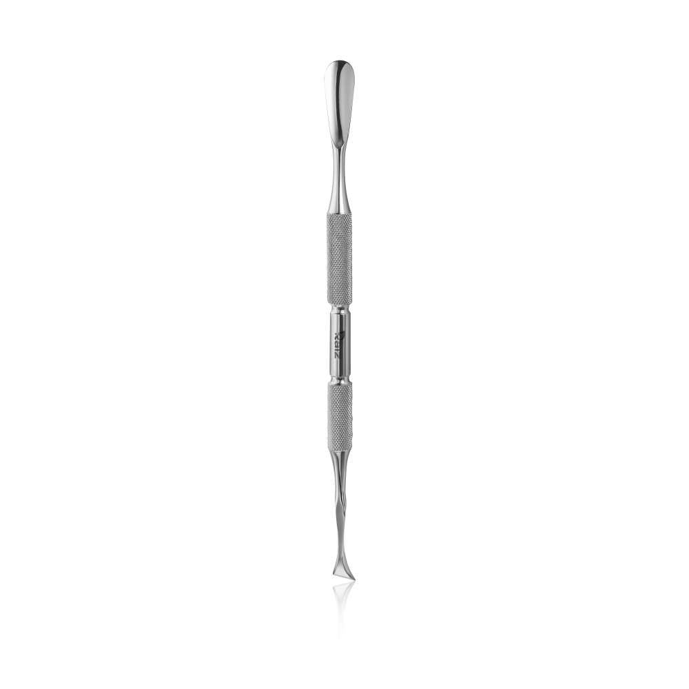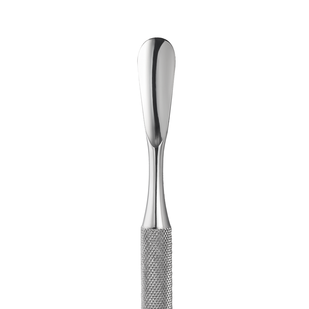 Лопатка манікюрна Raiz Work form 2 (закруглений пушер+відігнута лопасть) закруглений пушер та відігнута лопасть, заточені власноруч майстрами; використовують як для манікюру, так і педикюру; підлягають багаторазовій заточці; підлягають дезінфекції в будь-яких розчинах, стерилізації та термічній обробці; ріфлена поверхня лопатки забезпечує надійну фіксацію інструменту у руці під час роботи; нержавіюча сталь.