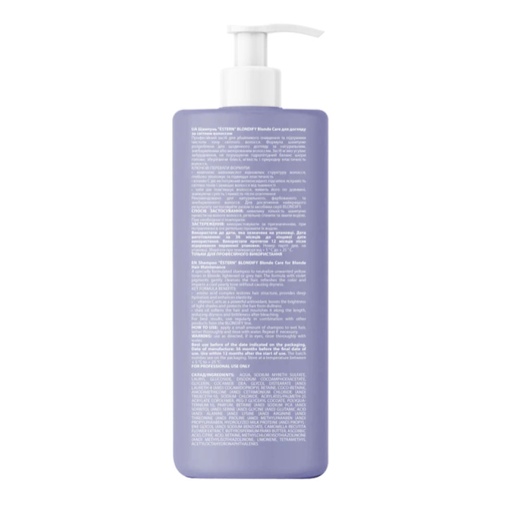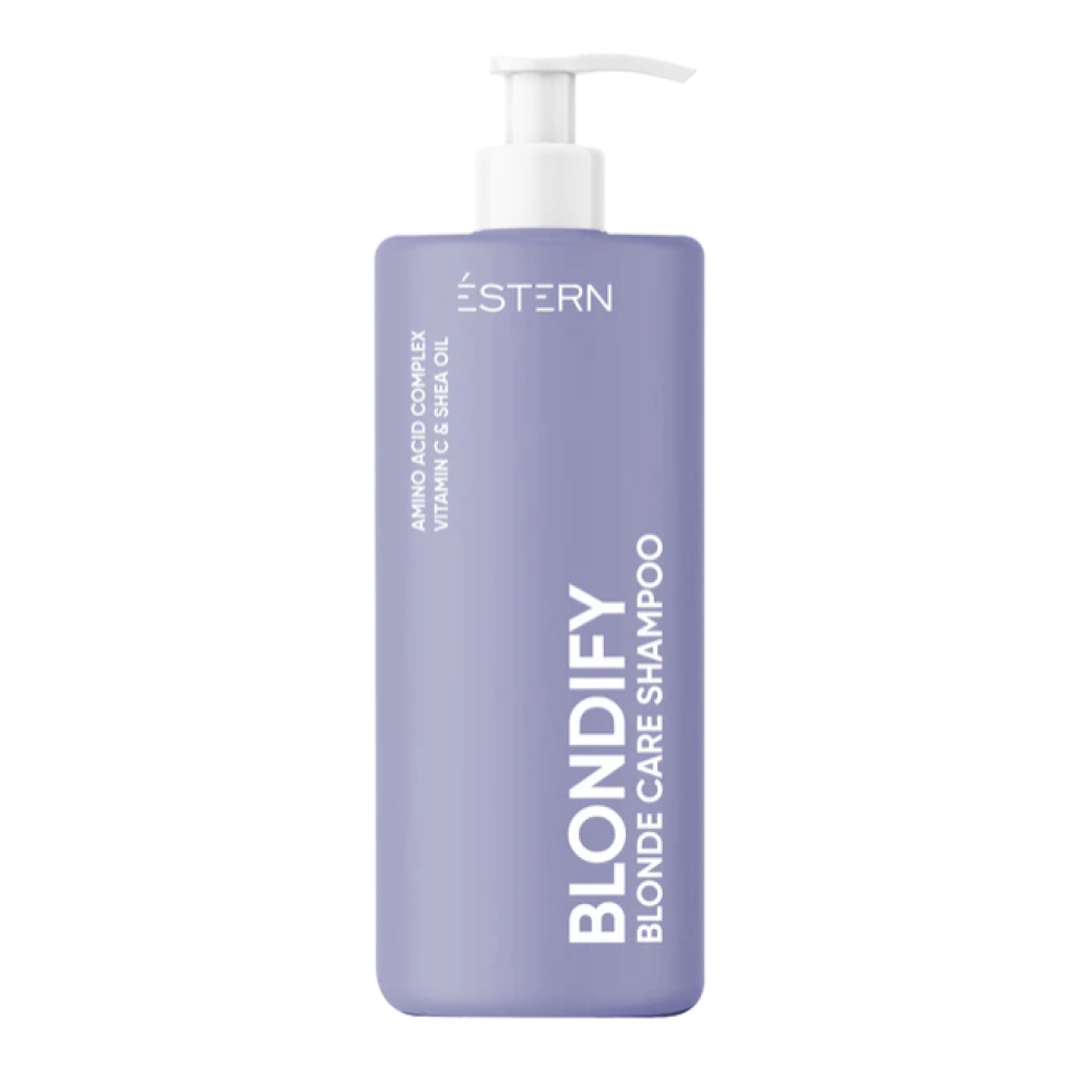 Estern Blondify Blonde Care Shampoo — професійний шампунь для дбайливого очищення та підтримання чистоти тону світлого, знебарвленого або мелірованого волосся. М’яка формула м’яко очищує, не порушуючи природний баланс, робить волосся еластичним, блискучим і шовковистим.Комплекс амінокислот відновлює структуру волосся, глибоко зволожує й надає йому міцності. Вітамін C діє як потужний антиоксидант, підсилює яскравість світлих відтінків і захищає волосся від тьмяності. Олія чіа пом’якшує волосся, живить його по довжині та зменшує сухість після освітлення.Підходить для натурального, фарбованого та знебарвленого волосся.Спосіб застосування: нанесіть невелику кількість шампуню на вологе волосся, помасажуйте до утворення піни, потім ретельно змийте водою. За потреби повторіть. Для найкращого результату використовуйте разом із засобами серії Estern Blondify Blonde Care.