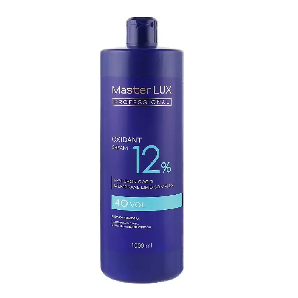 Окислювальна емульсія Master LUX.Універсальний крем-окислювач для застосування з крем-фарбами та знебарвлюючими пудрами Master LUX professional. Формула збагачена Гіалуроновою кислотою та мембранно-ліпідним комплексом для збереження балансу вологи та захисту волосся під час фарбування або освітлення волосся.40 vol – 12% для освітлення на 4-5 рівнів.