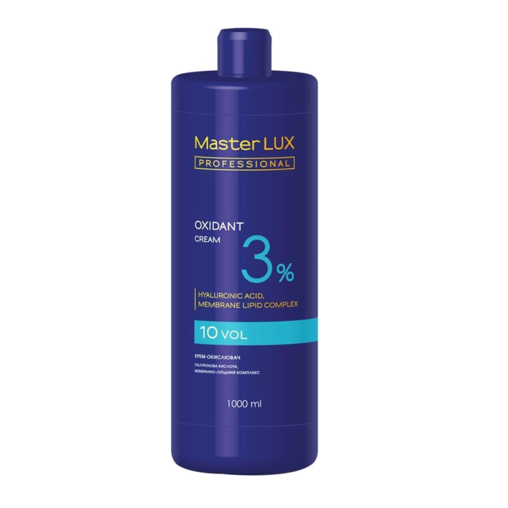 Окислювальна емульсія Master LUX.Універсальний крем-окислювач для застосування з крем-фарбами та знебарвлюючими пудрами Master LUX professional. Формула збагачена Гіалуроновою кислотою та мембранно-ліпідним комплексом для збереження балансу вологи та захисту волосся під час фарбування або освітлення волосся.10 vol - 3% фарбування  тон в тон, підняття натуральної бази на 1 рівень, затемнення, знебарвлення