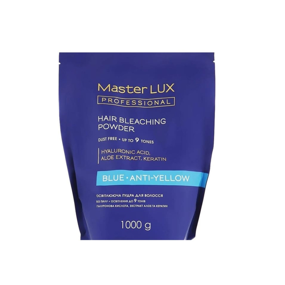 Пудра для освітлення волосся Blue Master LUX.Освітлююча пудра Blue Anti-yellow Master LUX Professional освітлює волосся до 9 тонів. Нейтралізує небажані жовто-помаранчовіі відтінки. Пудра блакитного кольору. Не пилить. Легко наноситься завдяки кремовій текстурі при змішуванні з кремом-окислювачем Master LUX professional. Кремоподібна консистенція освітлювальної маси не висихає протягом усього часу дії. Підходить для всіх типів волосся та технік освітлення.У складі:Гіалуронова кислота, Екстракт алое, Кератин. Мають потужні зволожуючі та відновлюючі властивості. Зберігають еластичність та міцність волосся.