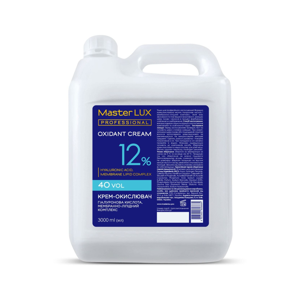Окислювальна емульсія Master LUX.Універсальний крем-окислювач для застосування з крем-фарбами та знебарвлюючими пудрами Master LUX professional. Формула збагачена Гіалуроновою кислотою та мембранно-ліпідним комплексом для збереження балансу вологи та захисту волосся під час фарбування або освітлення волосся.40 vol – 12% для освітлення на 4-5 рівнів.