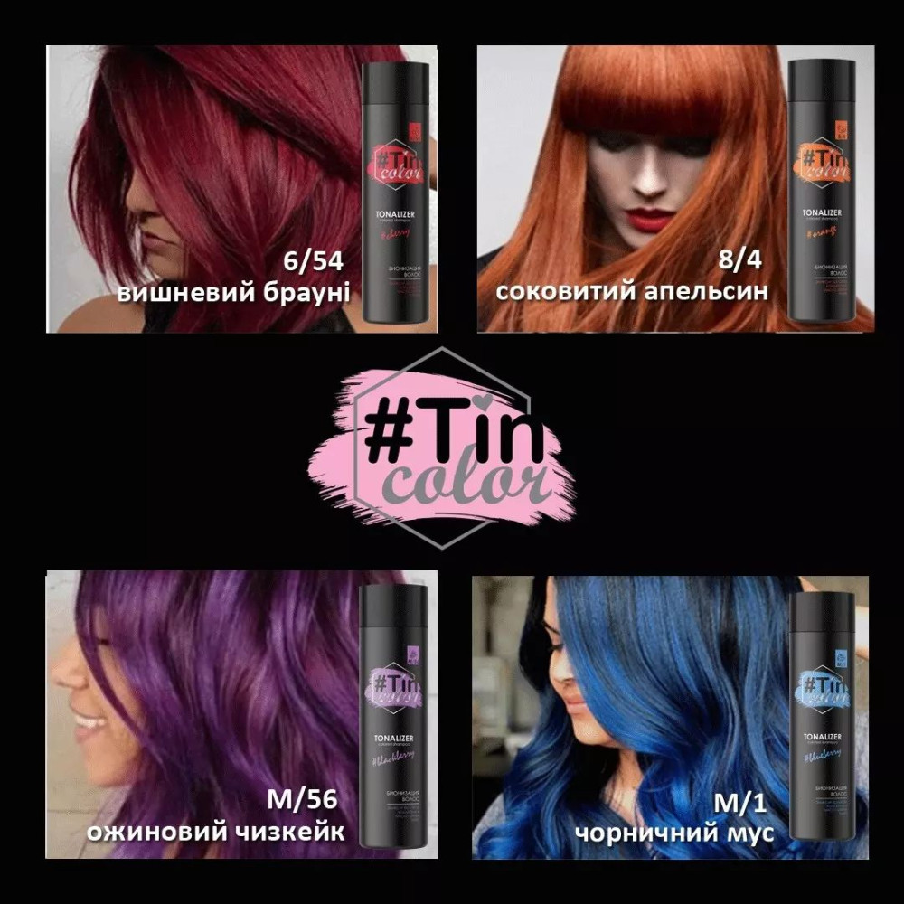 Тонуючий шампунь (тоналайзер) TIN COLOR.Ідеально підходить для підтримки насиченості кольору волосся між фарбуваннями.За його допомогою можна підфарбувати волосся тон в тон або на 1 тон темніше.Має у складі волокна колагену та олію квітів тіарі.Легкий у використанні, бо не потребує змішування з окислювальною емульсією.Не містить аміаку.У палітрі 8 трендових відтінків:- 0/00 підтримує холодний відтінок волосся без накопичення.- 10/65 надає блонду рожевого відтінку, його можна наносити як в чистому вигляді, так і розбавляти звичайним шампунем для меншої інтенсивності кольору.- 8/1 підтримує холодний тон блонду або русявого волосся, він інтенсивніший за 0/00.- 8/4 підходить для всіх мідних відтінків- 6/54 червоно-рожевий колір, можна наносити у чистому вигляді для насиченого червоного кольору або розбавляти звичайним шампунем, щоб отримати легкий відтінок.- 5/7 прекрасно підтримує темні відтінки волосся, не має рудого підтону, щільно лягає.- М56 та М1 це яскраві відтінки, які добре лягають на знебарвлене або нефарбоване волосся, ними можна зробити яскравий акцент на прядках або сміливе фарбування всього волосся.Спосіб застосування:Нанести та розподілити на чисте, злегка підсушене волосся, залишити на 5-15 хв та змити. Потім нанести бальзам або маску для фарбованого волосся.Наносити у рукавичках.Об'єм 250 мл.