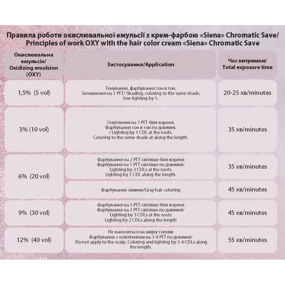 Професійна стійка аміачна крем-фарба Siena Chromatic Save у системі Save Color.Має систему ANTI GRAY SYSTEM, яка зафарбовує сивину без додаткових процедур. І майстри, і клієнти відзначають відмінний результат.У фарбнику присутній нейтралізатор запаху для комфортної роботи.Містить OIL CHROMATIC SAVE - це додатковий комплекс для шкіри голови та волосся для догляду під час фарбування, який додається до суміші.В цей комплекс входить:гідролізований кератин, олія зародків пшениці та олія вівса.Він не тільки не заважає процесу фарбування та проникненню пігменту у волосся, а навіть підвищує насиченість кольору.Основна гама відтінків працює з рівнем глибини тону (РГТ) від 2 до 10.Палітра 12-го рівня може висвітлювати на 2 рівні з 8-го натурального за допомогою 9% окислювача. Даним рядом  можна робити інтенсивне або пастельне тонування.Палітра Special Blond дозволяє піднімати з 6 ргт на 4-5 рівнів.Відтінки Mix Tones використовуються як самостійні барвники і для створення нових кольорів.У комплект входить:- тюбик з крем-фарбою, 90 мл- 2 саше з OIL CHROMATIC SAVE, 3 г.Окисник не входить до комплекту, його можна придбати окремо.