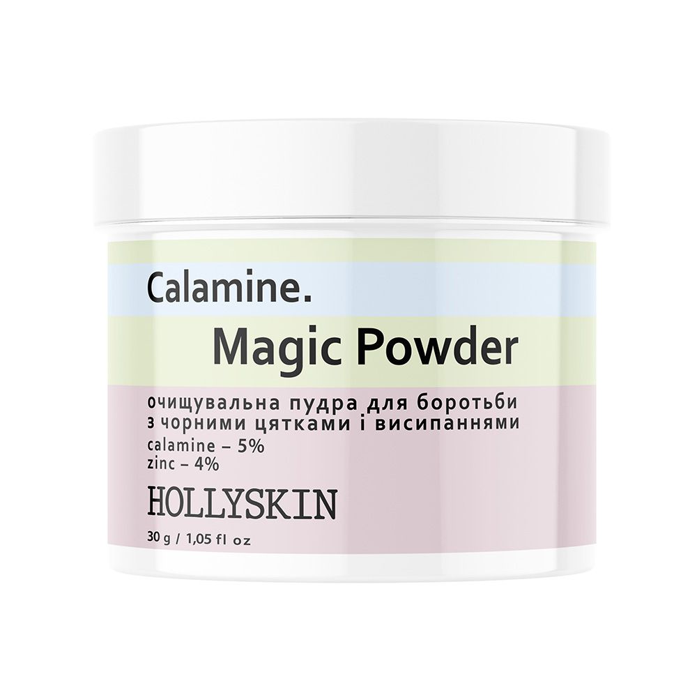 Пудра для очищення обличчя від чорних цяток та висипань HOLLYSKIN Calamine Magic Powder 30 г. Унікальний засіб для проблемної шкіри помітно покращує її стан уже після першого використання:• глибоко очищує пори;• зменшує кількість чорних цяток;• усуває жирний блиск у т-зоні;• м’яко полірує, висвітлює і розгладжує обличчя. Спеціально оброблений карбонат кальцію має покращену абсорбцію шкірного сала, сприяє видаленню жирних кислот з пор, пригнічує розвиток запалень, робить пори менш помітними. Каламін швидко позбавляє від подразнень, свербежу, почервонінь і набряків. Оксид цинку помітно зменшує кількість запальних елементів. Блакитна глина вирівнює тон, має потужну антисептичну дію, зміцнює бар'єрну функцію шкіри і покращує її еластичність.