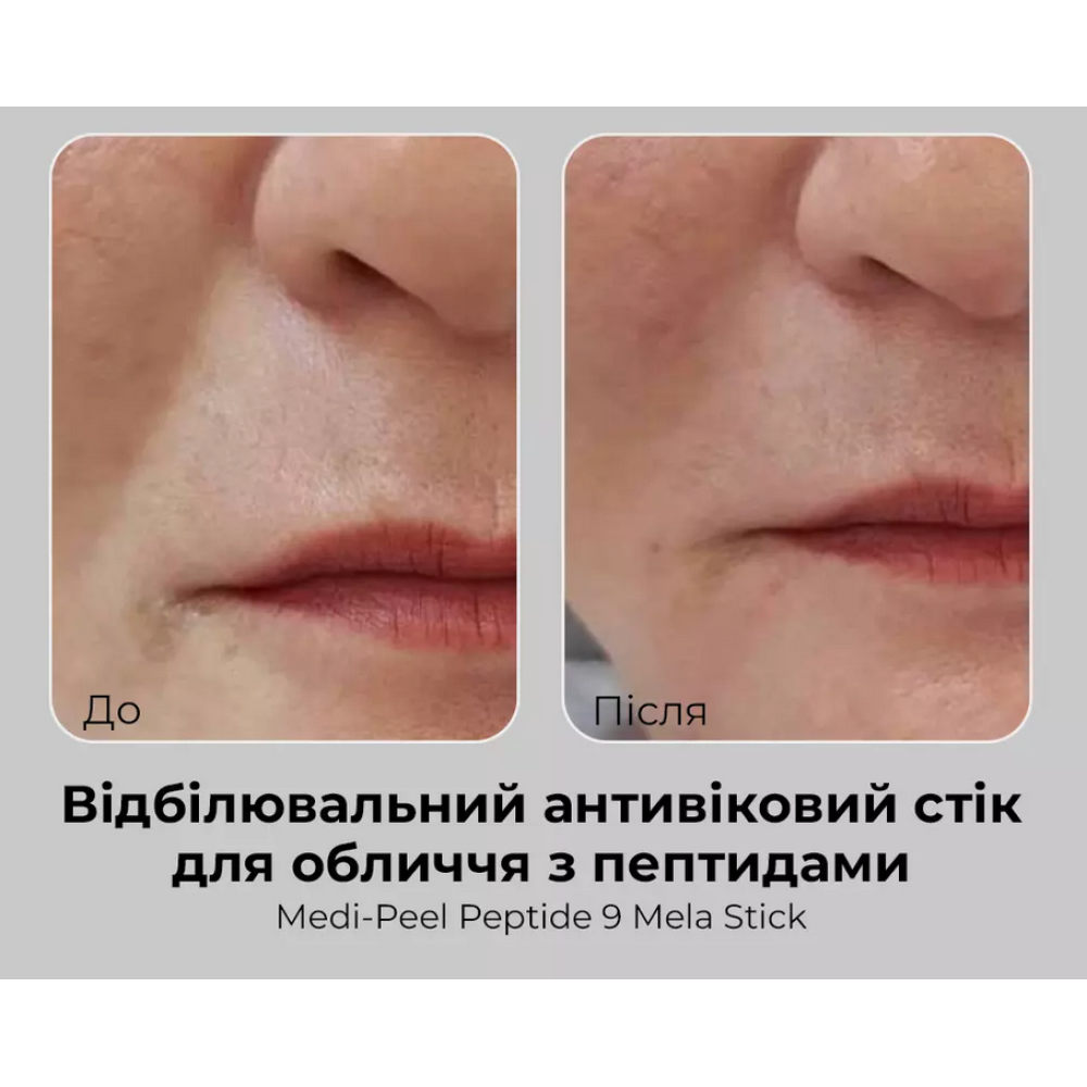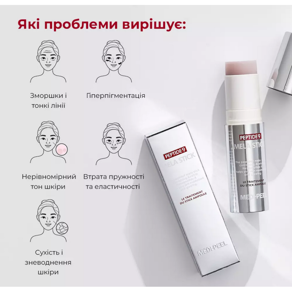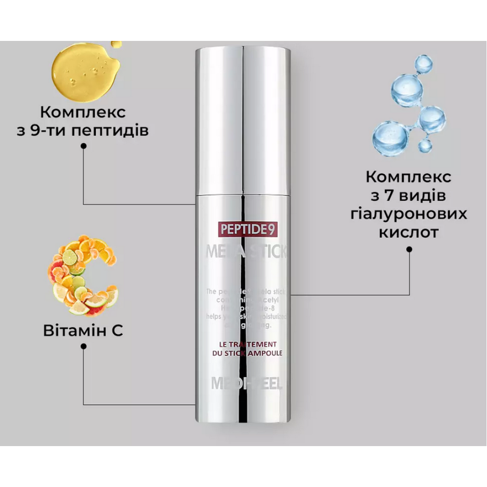 Стік Medipeel Peptide9 Mela Stick з пептидами ефективно бореться з ознаками старіння, допомагає розгладити зморшки, підвищує пружність і еластичність шкіри, вирівнює тон і текстуру обличчя, інтенсивно живить і зволожує, надаючи шкірі свіжий, доглянутий і молодший вигляд, зручно застосовується на проблемні ділянки, ідеально підходить для в’янучої та втомленої шкіри, забезпечуючи видимий омолоджуючий ефект без додаткових процедур.